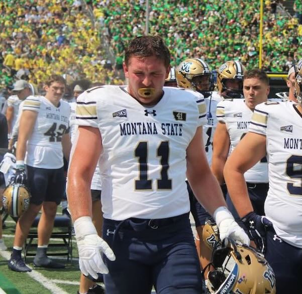 Montana State captains Kenneth Eiden IV (11) and JT Reed lead the Bobcats onto the field at Autzen Stadium/ by Brandon SullivanOregon tight end Kenyon Sadiq, a projected future first-round draft pick, hurdles a Bobcat defender/ by Brandon SullivanJacob Trimble hauls in a catch in the second half against Oregon/ by Brandon Sullivan