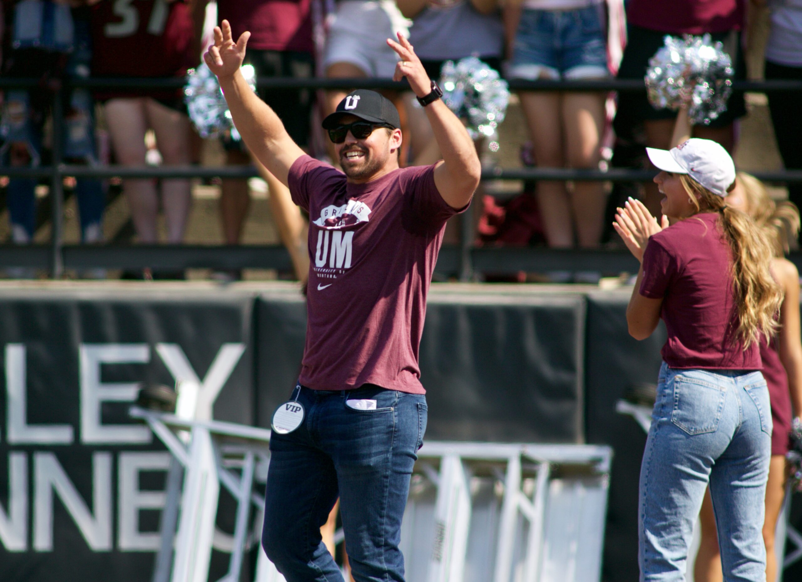 Former Griz and NFL linebacker Brock Coyle pumps up the crowd/ by Brooks Nuanez