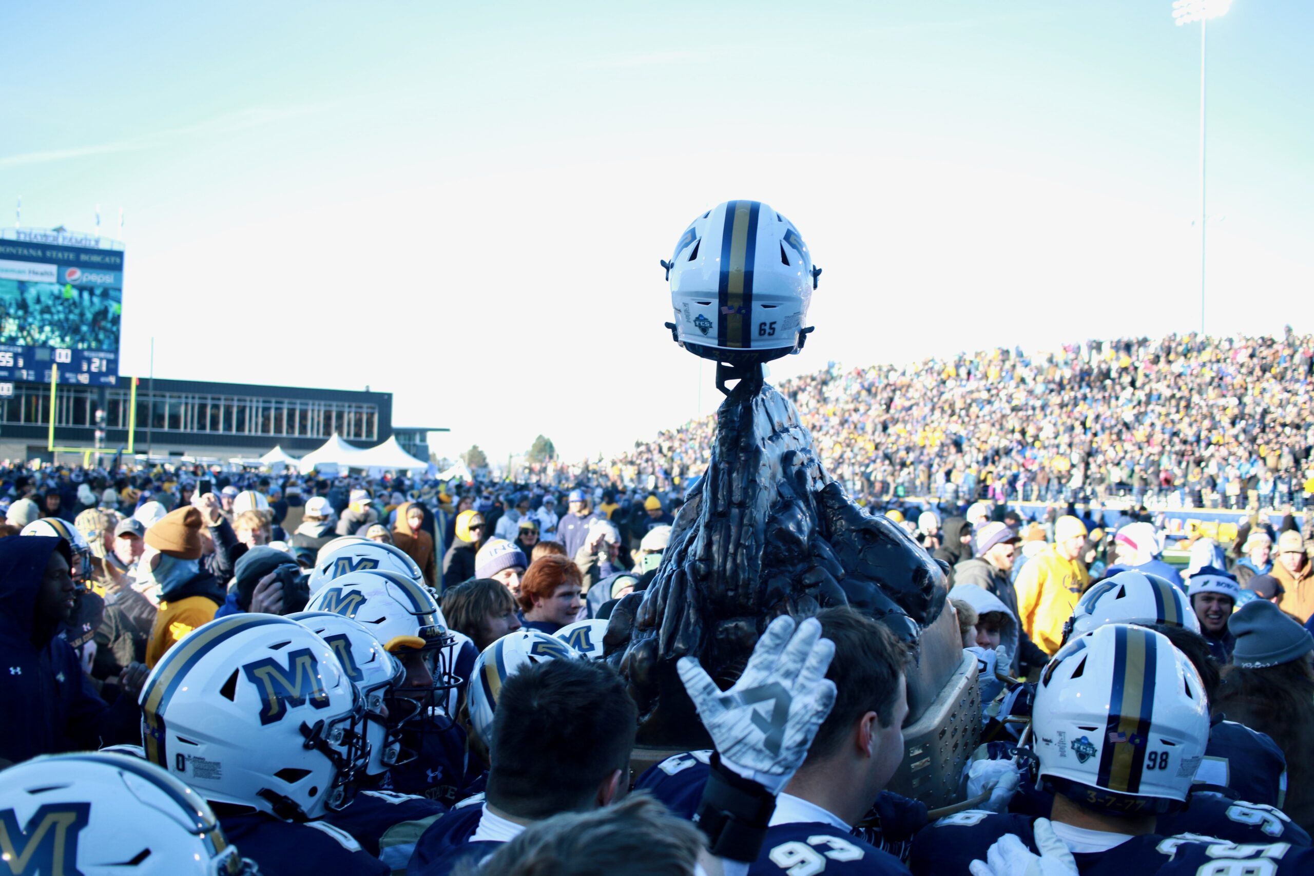 This time it’d be in Bozeman. Right there in the Litter Box that was having its Cinderella moment beamed to a national audience on ABC. Its new-ish South end zone and its flanking grandstands packed to the fucking gills with Cats. So full you could literally feel the structure sway anytime a Cat found his way to the end zone. Its giant scoreboard gleaming bright in front of the Cats’ new athletic complex as the strong winds rolled in and dusted the snow off their indoor practice facility — the one any Cat’ll use to remind every Griz fan that it isn’t an impermanent bubble. Every structural reminder that the Cats had erased the gap between them and the Griz was playing its part. Jesus Christ, it was the shimmering stage the Cats had longed to bludgeon the Grizzlies on. For most of the first half they did.