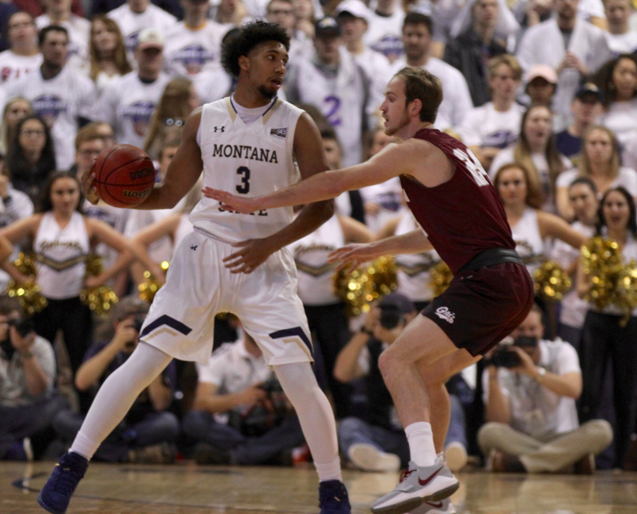 Montana State senior guard Tyler Hall (3) with Brian Fish/by Brooks Nuanez