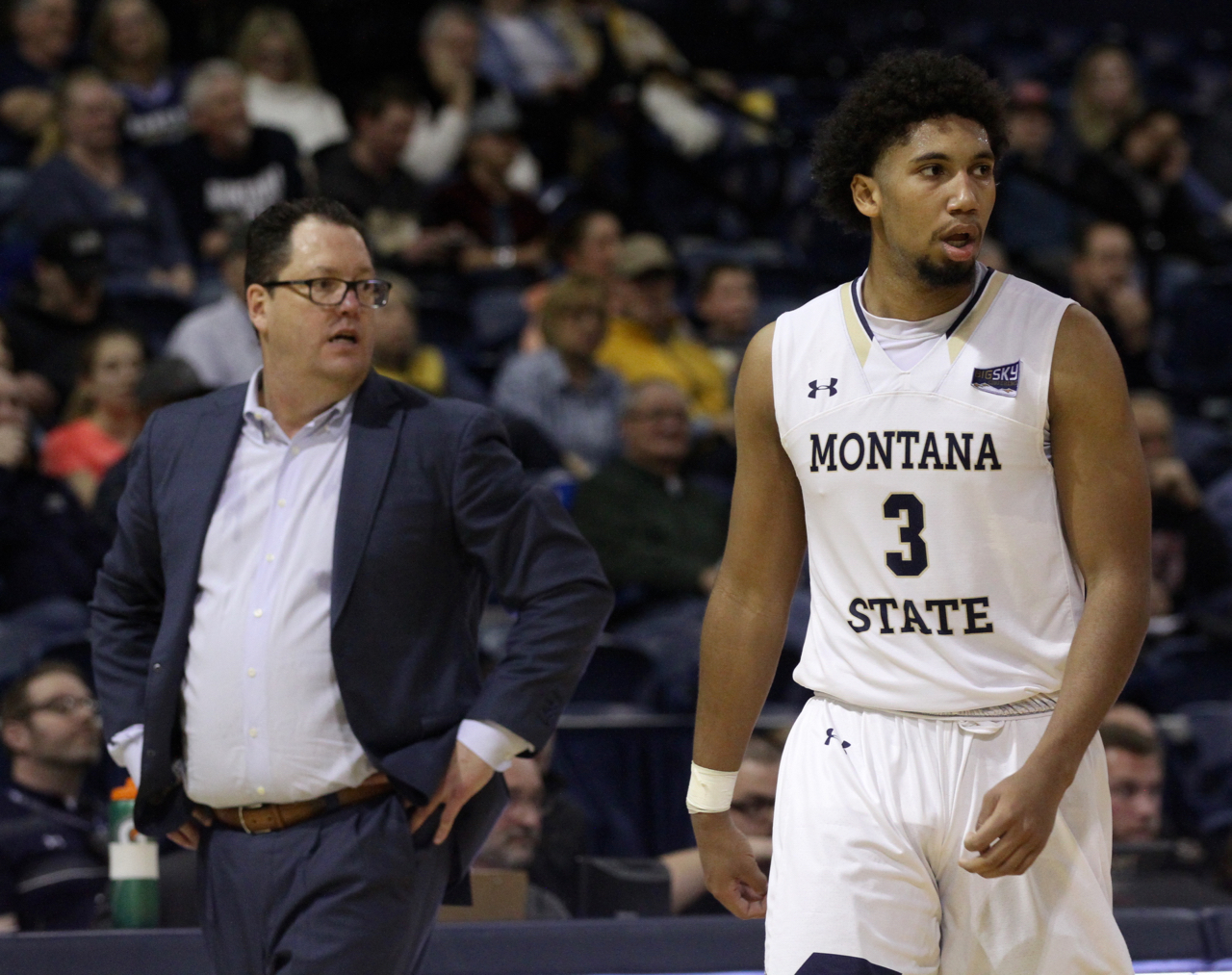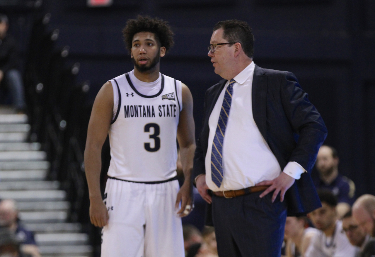 Montana State senior guard Tyler Hall (3) with head coach Brian Fish/by Brooks Nuanez