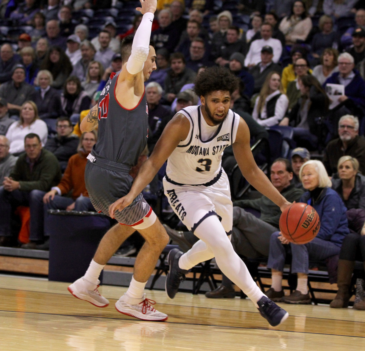 Montana State senior guard Tyler Hall (3) in 2016 vs Montana forward Bobby Moorehead (24)/by Brooks Nuanez