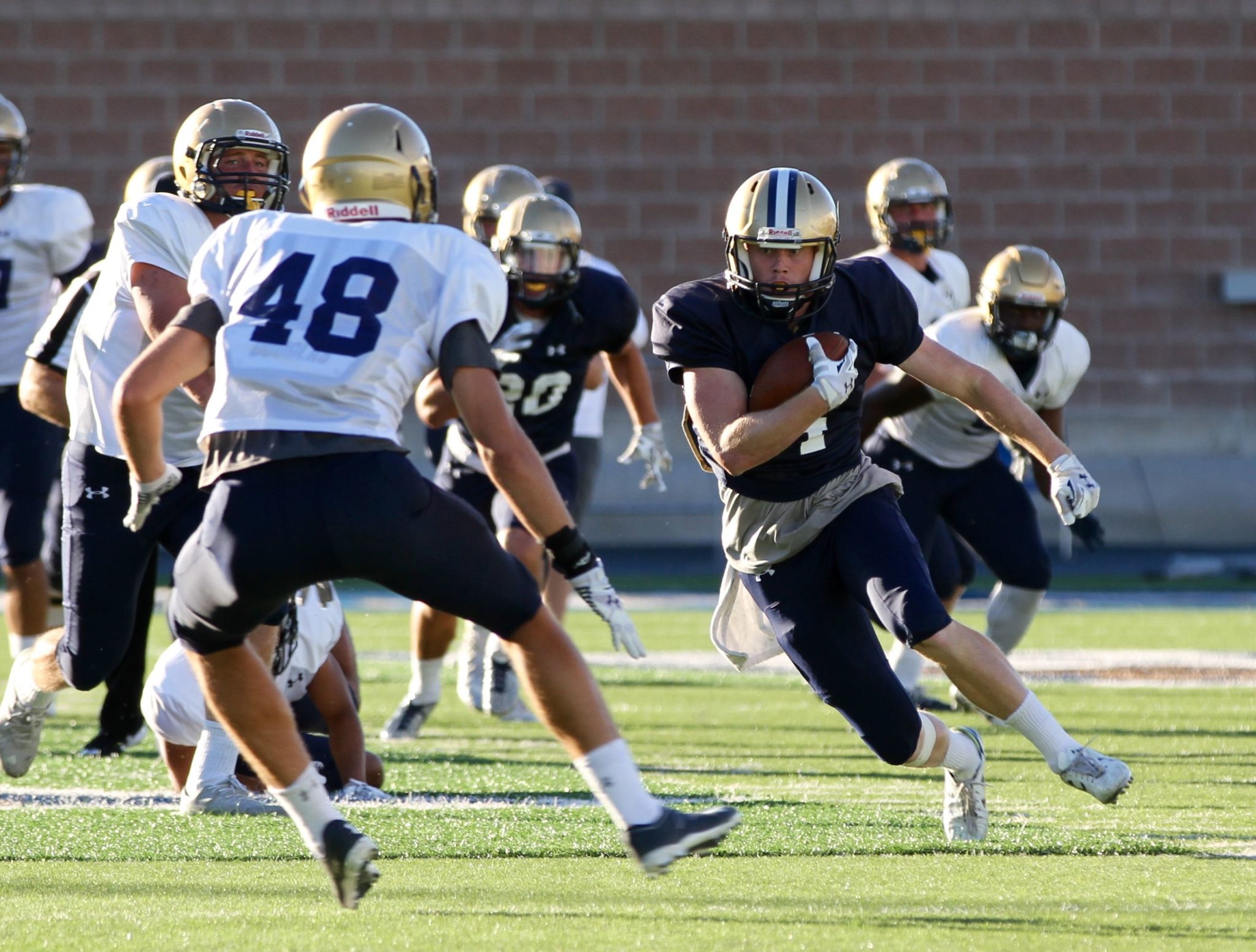 After a series of poor punts from Tandberg and true freshman Jered Padmos, the first-team offense took the field gain. Bruggman began the drive with a laser to Paige for a 21-yard gain. His second throw, a dump-down to senior running back Gunnar Brekke, netted 14 yards and his third completion of the drive was a bullet to Paige on a hitch for another first down.