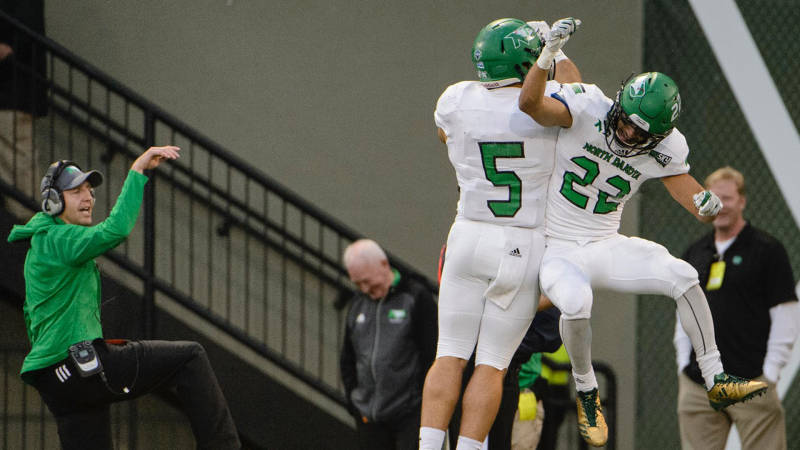 Brady Oliveira (5) and John Santiago celebrate on Saturday/ by UND athletics