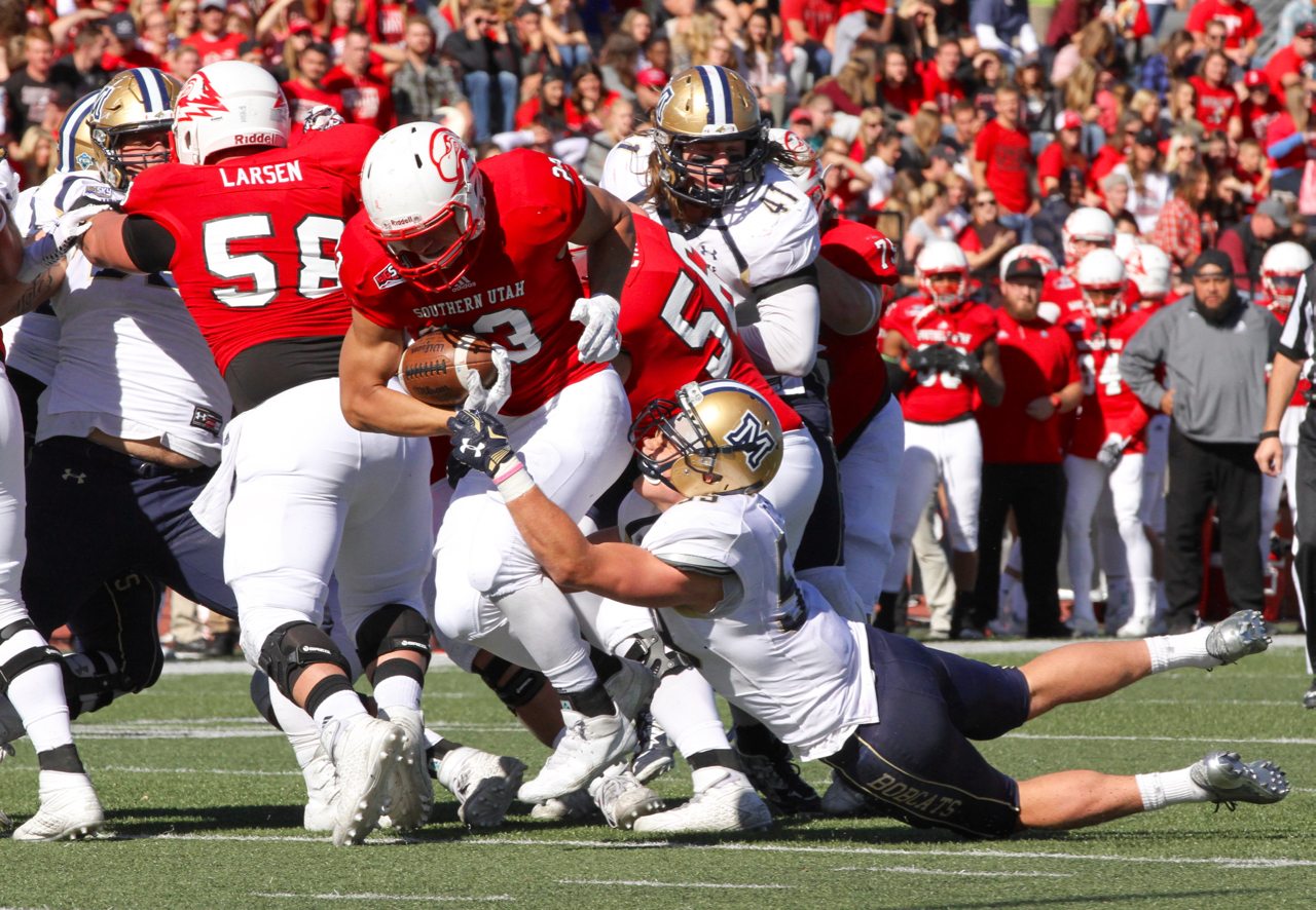 Southern Utah running back James Felila (23) runs through Montana State linebacker Fletcher Collins (59) tackle in a 38-21 SUU victory in Cedar City, UT Saturday/by Brooks Nuanez