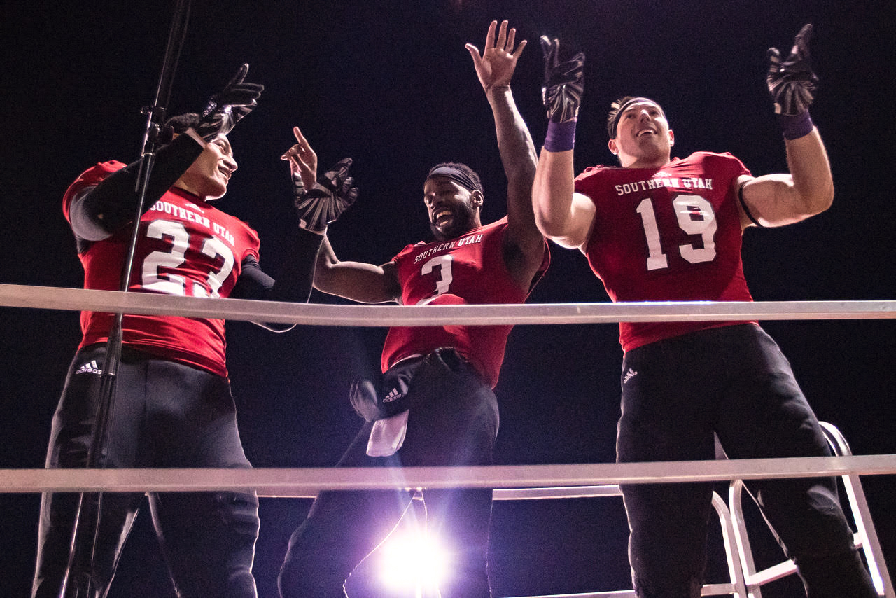Southern Utah running back James Felila (23), quarterback Patrick Tyler (3) and tight end Logan Parker (19) celebrate SUU’s win over Eastern Washington on Saturday night/ SUU Athletics