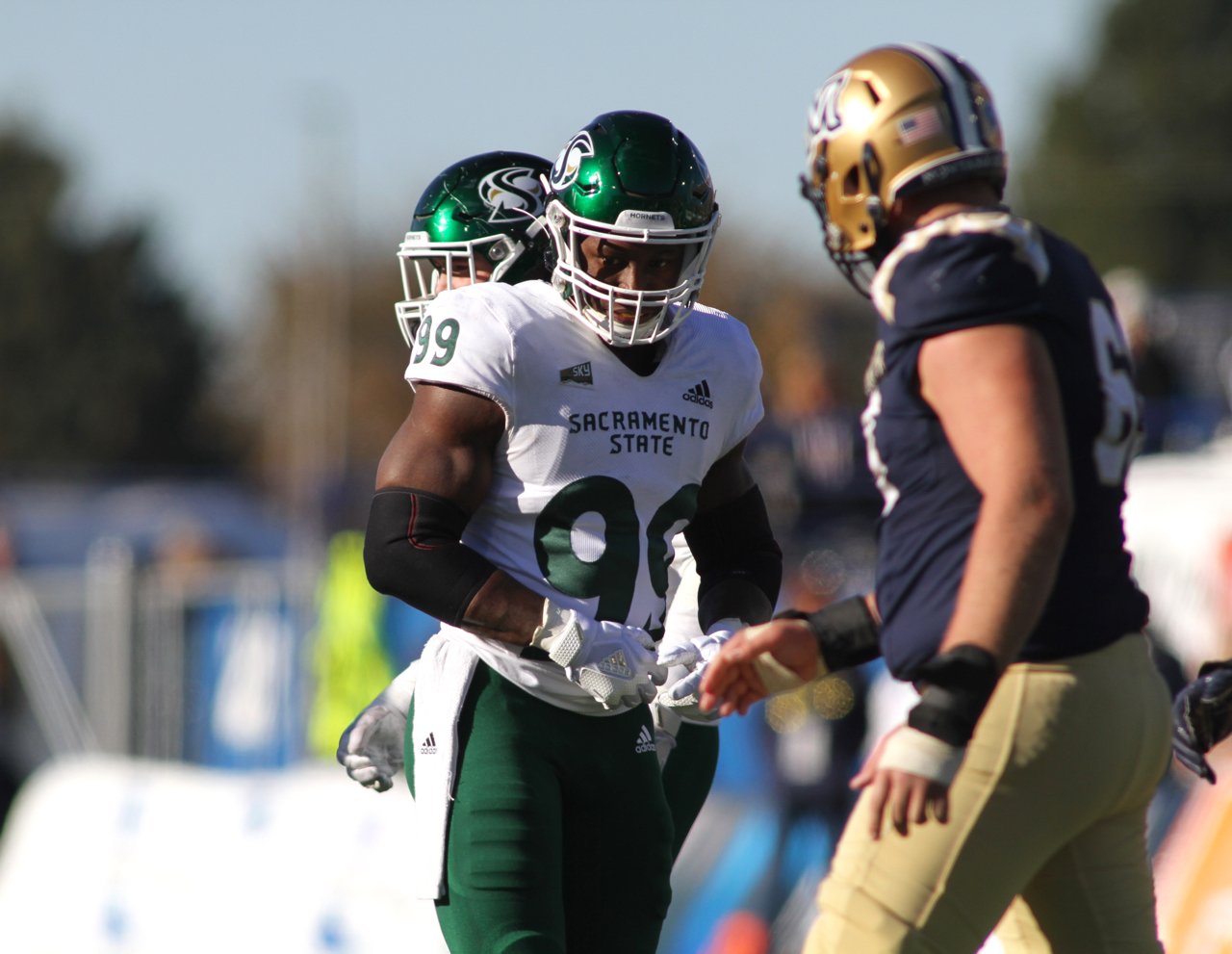 Sacramento State defensive end George Obinna (99) in 2019/by Brooks Nuanez