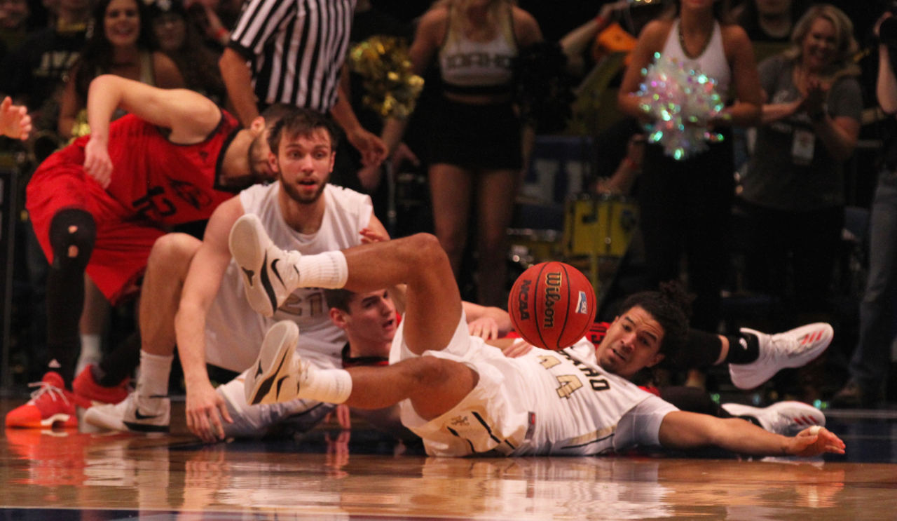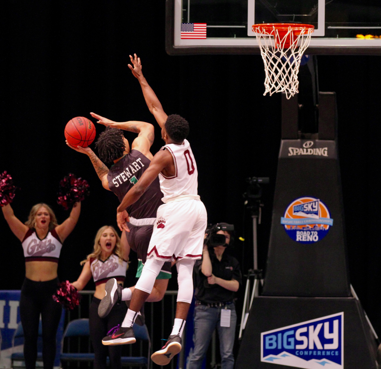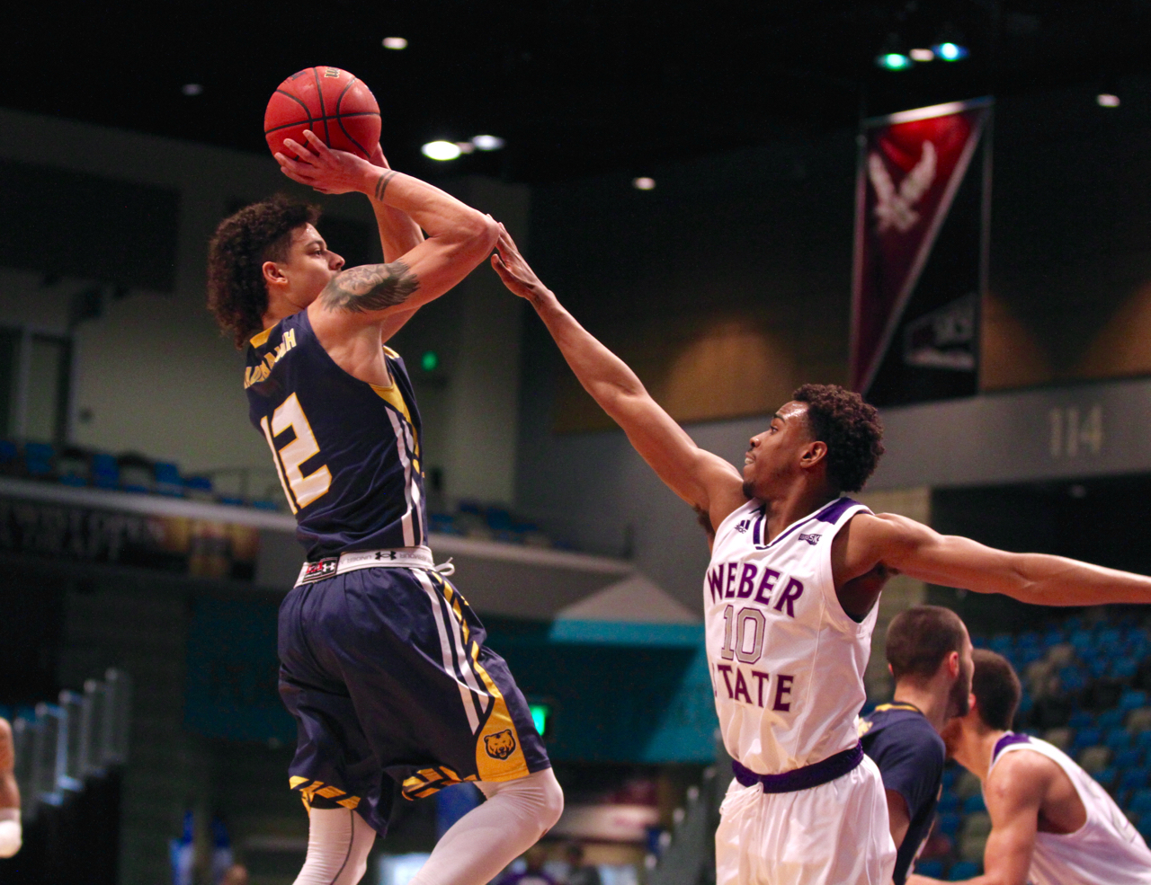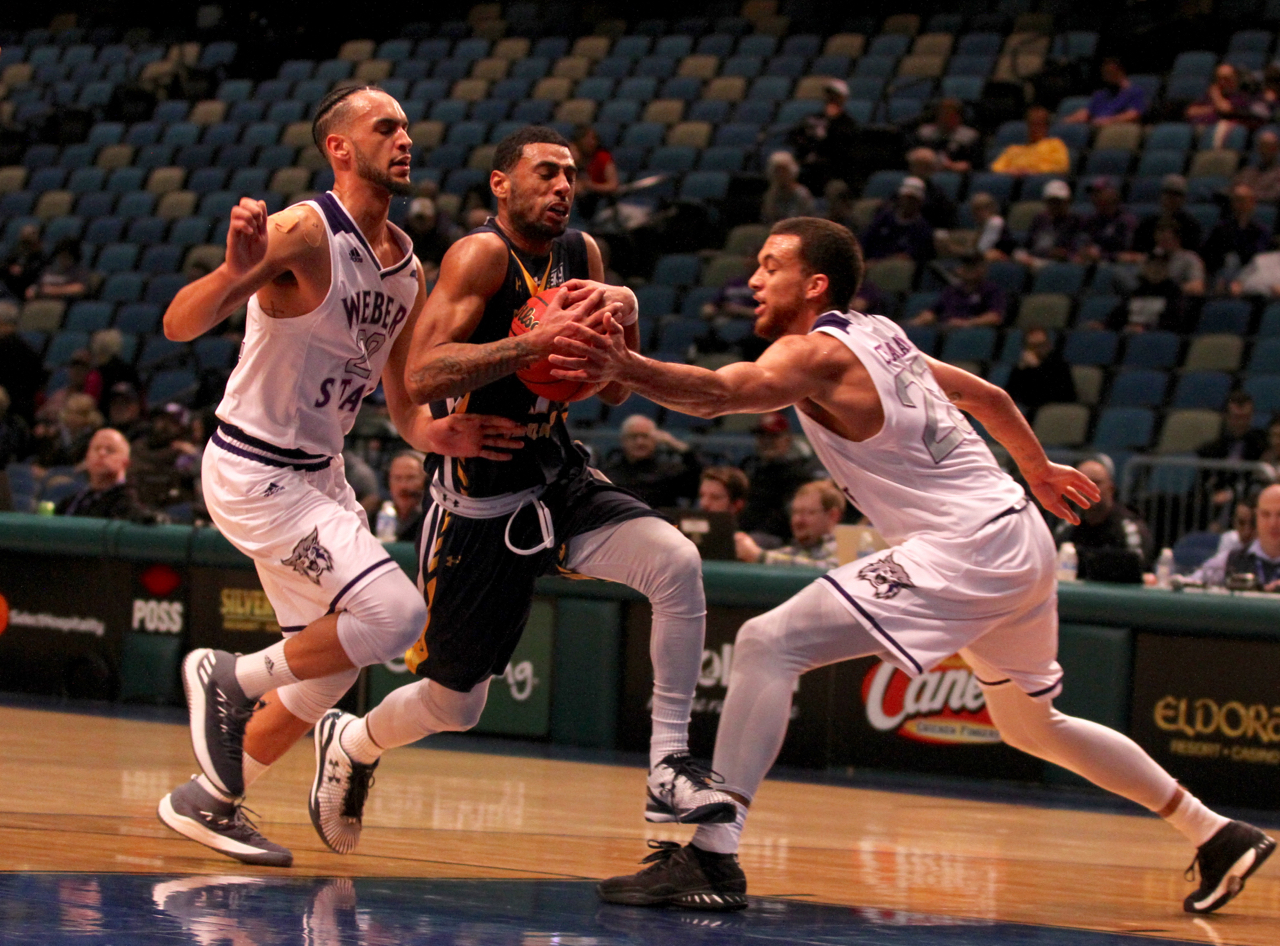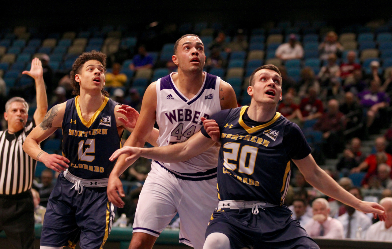 Northern Colorado forward Tanner Morgan (20) and guard Jonah Radebaugh (12) box out Weber State forward Zach Braxton (44)/by Brooks Nuanez
