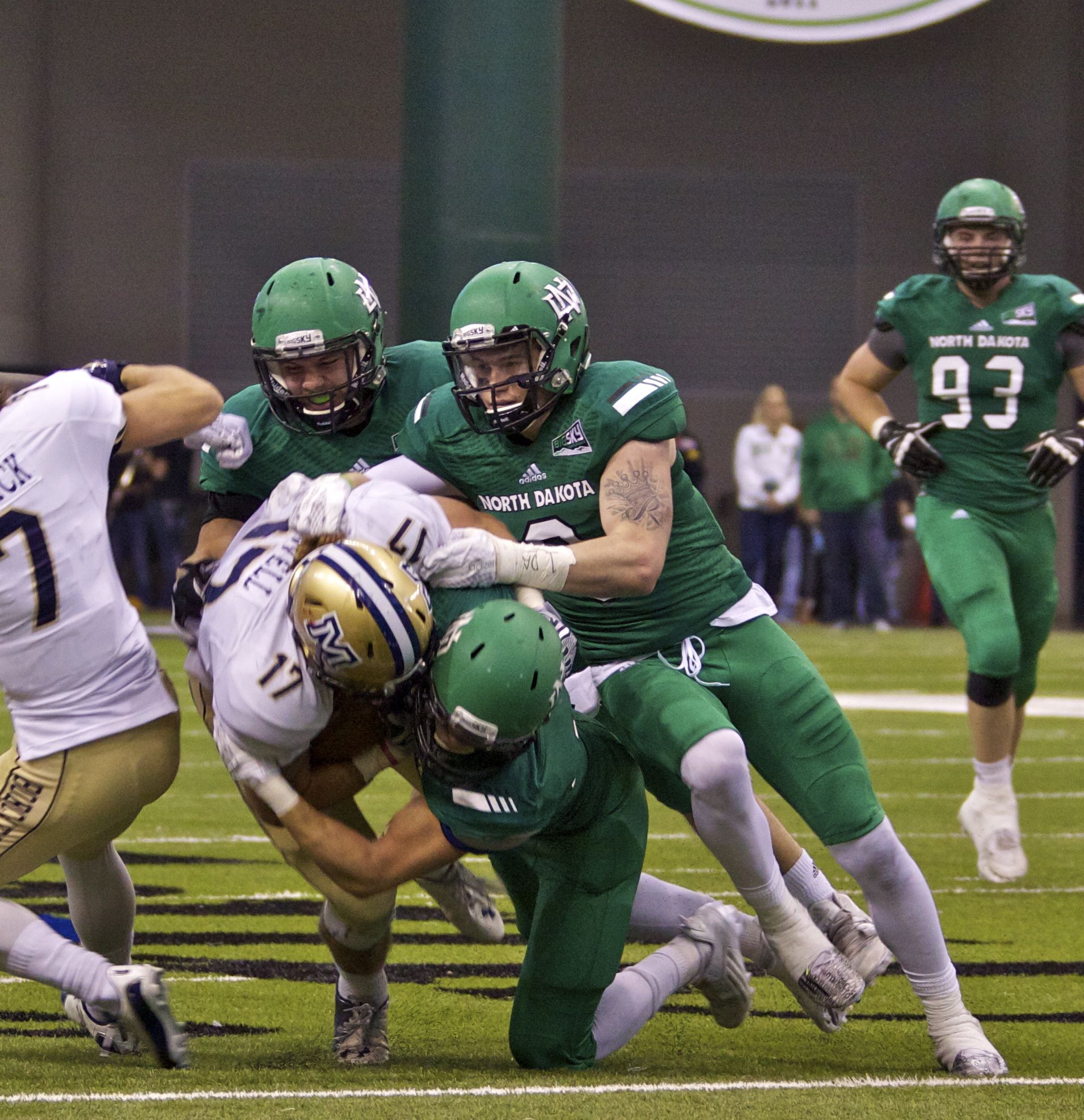 Reyes made eight tackles, with two tackles for loss and a sack. He also recovered two fumbles, and forced another. On top of it all, he had a safety in the third quarter that helped UND take a 9-7 lead.