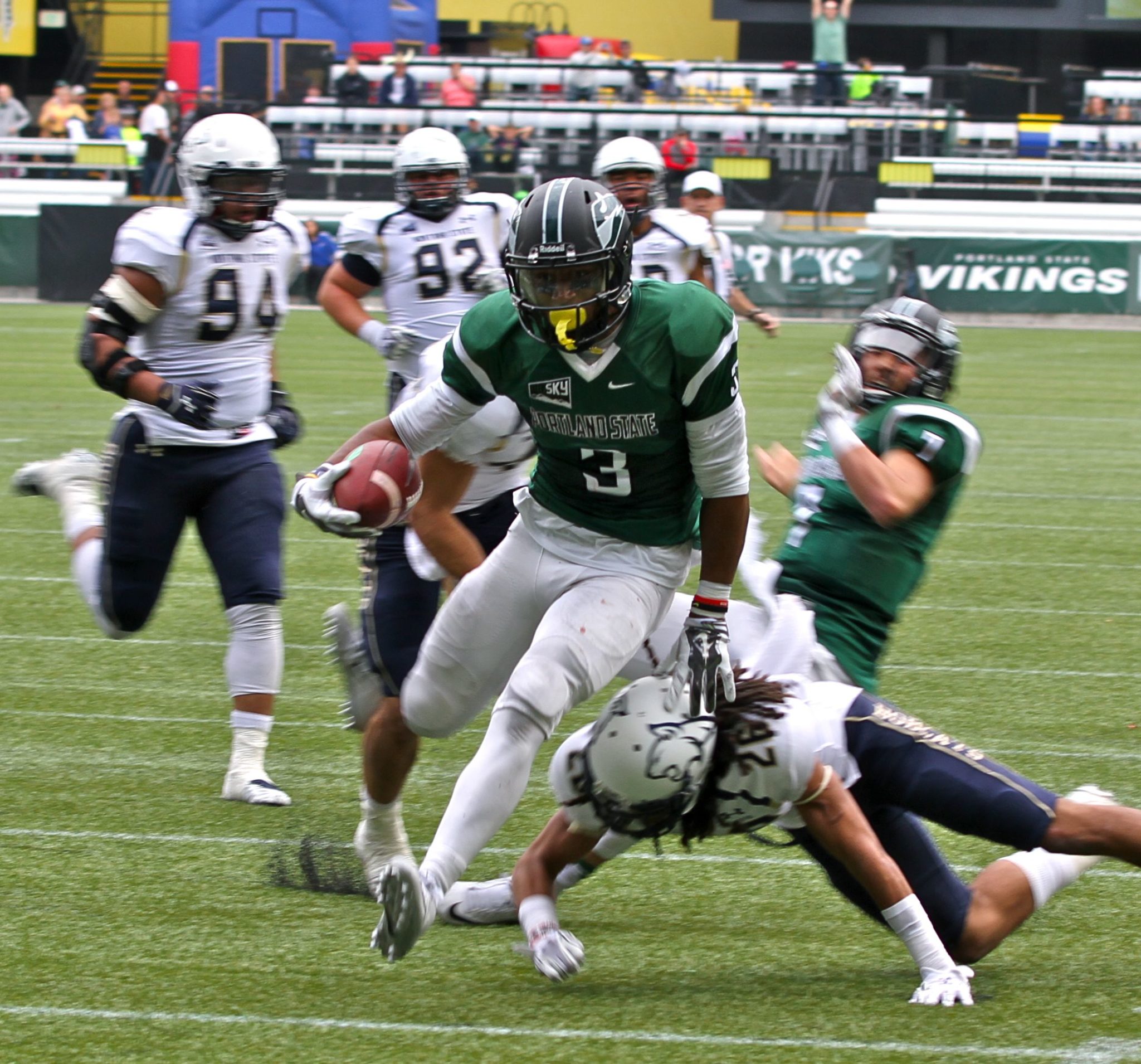 Jones now has 621 yards rushing and six touchdowns on 68 carries. His 9.3 yards per carry lead the nation. Portland State rushed for a school-record 467 yards on Saturday. The Vikings scored on eight consecutive possessions to being the game, piled up 682 yards and notched 32 first downs all told.