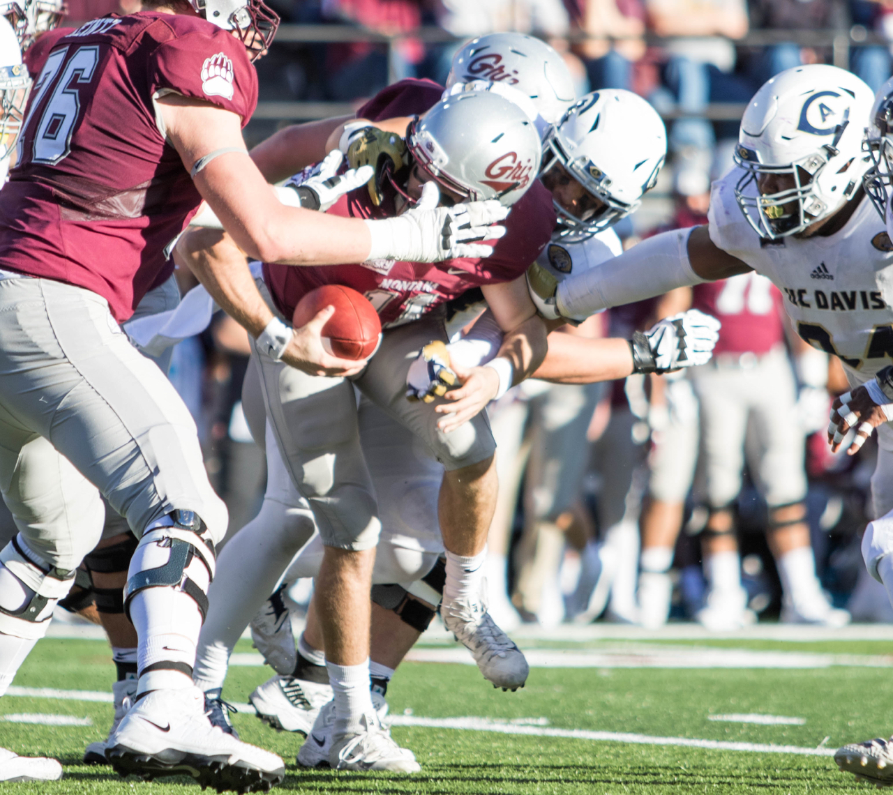 Montana quarterback Dalton Sneed gets his face mask ripped on Saturday against UC Davis/ by Jason Bacaj