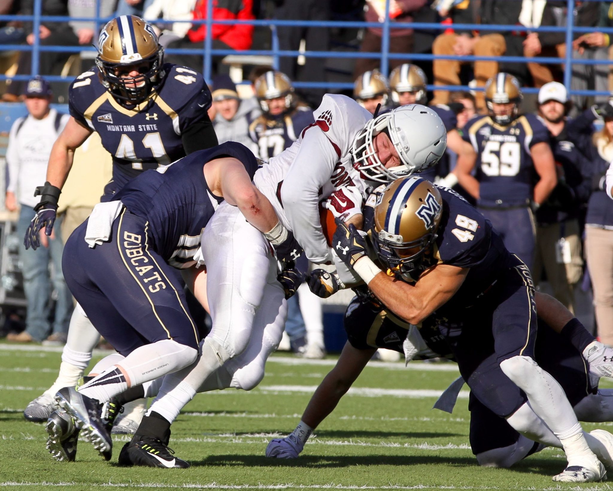 Montana State linebacker Mac Bignell & safety Bryson McCabe hits Montana wide receiver Josh Horner in 2015/by Brooks Nuanez