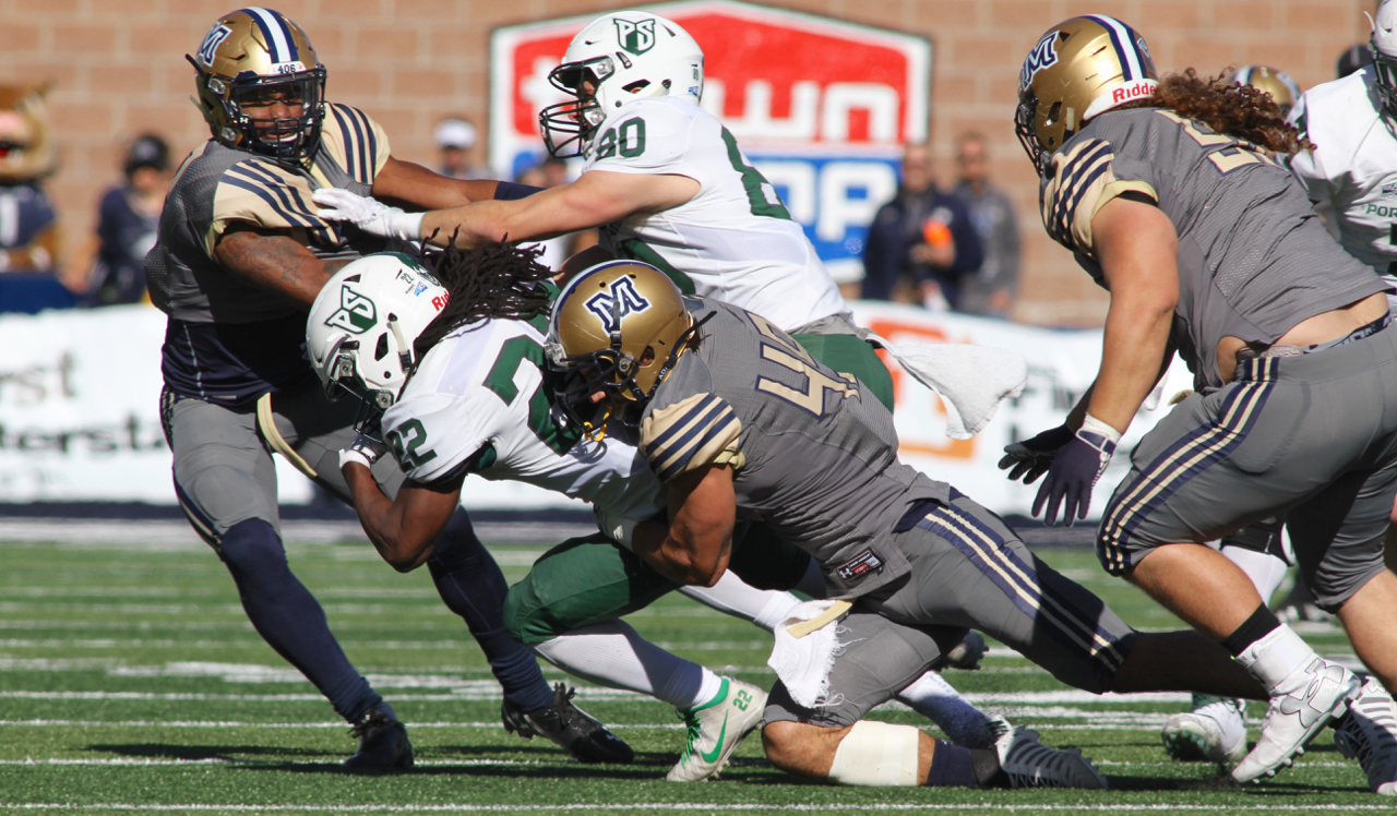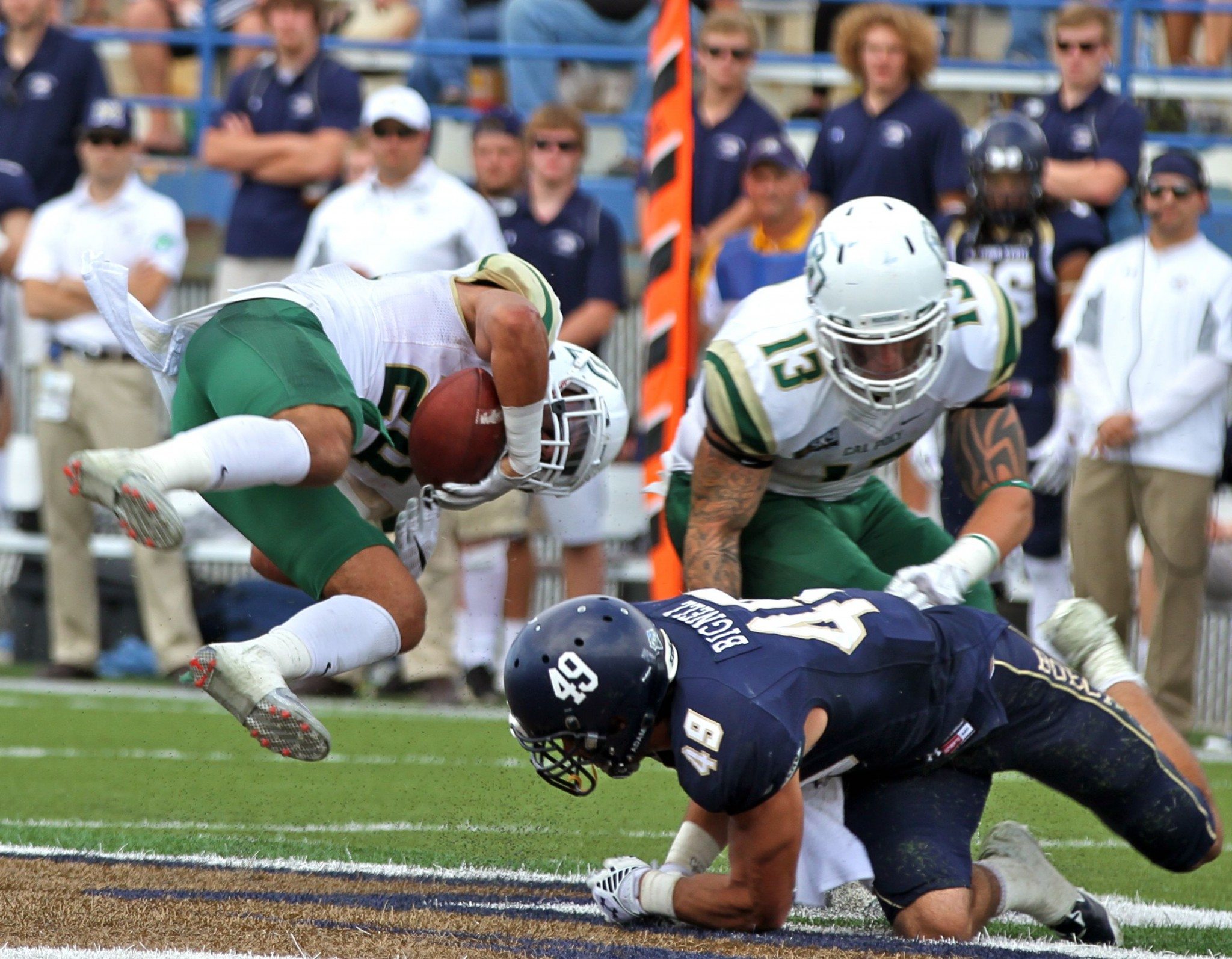 Montana State linebacker Mac Bignell records a tackle for loss on Cal Poly running back Kori Garcia in 2016/by Brooks Nuanez