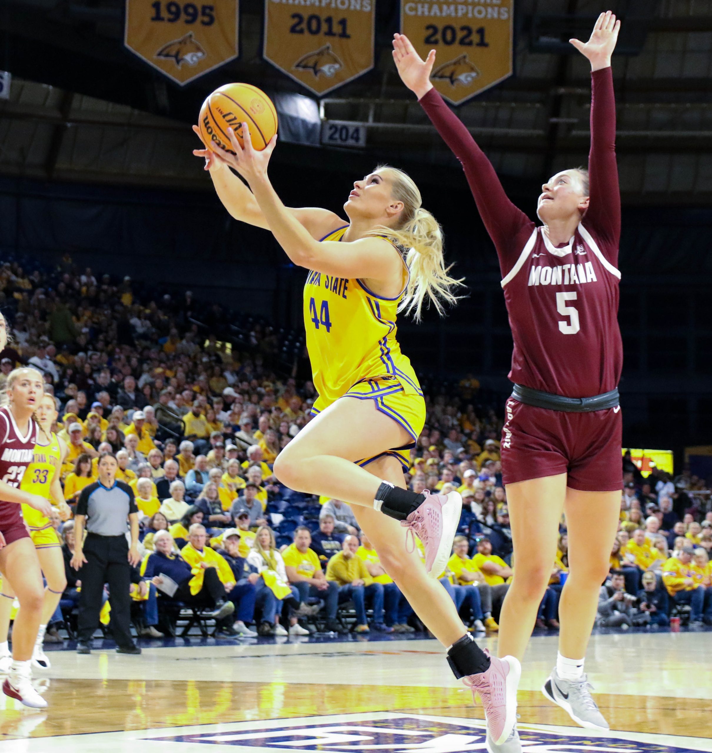 At the break, Montana State unveiled its football banners, rolling down its 18th Big Sky Conference title banner and its fourth national championship banner to the delight of the 4,173 in attendance.