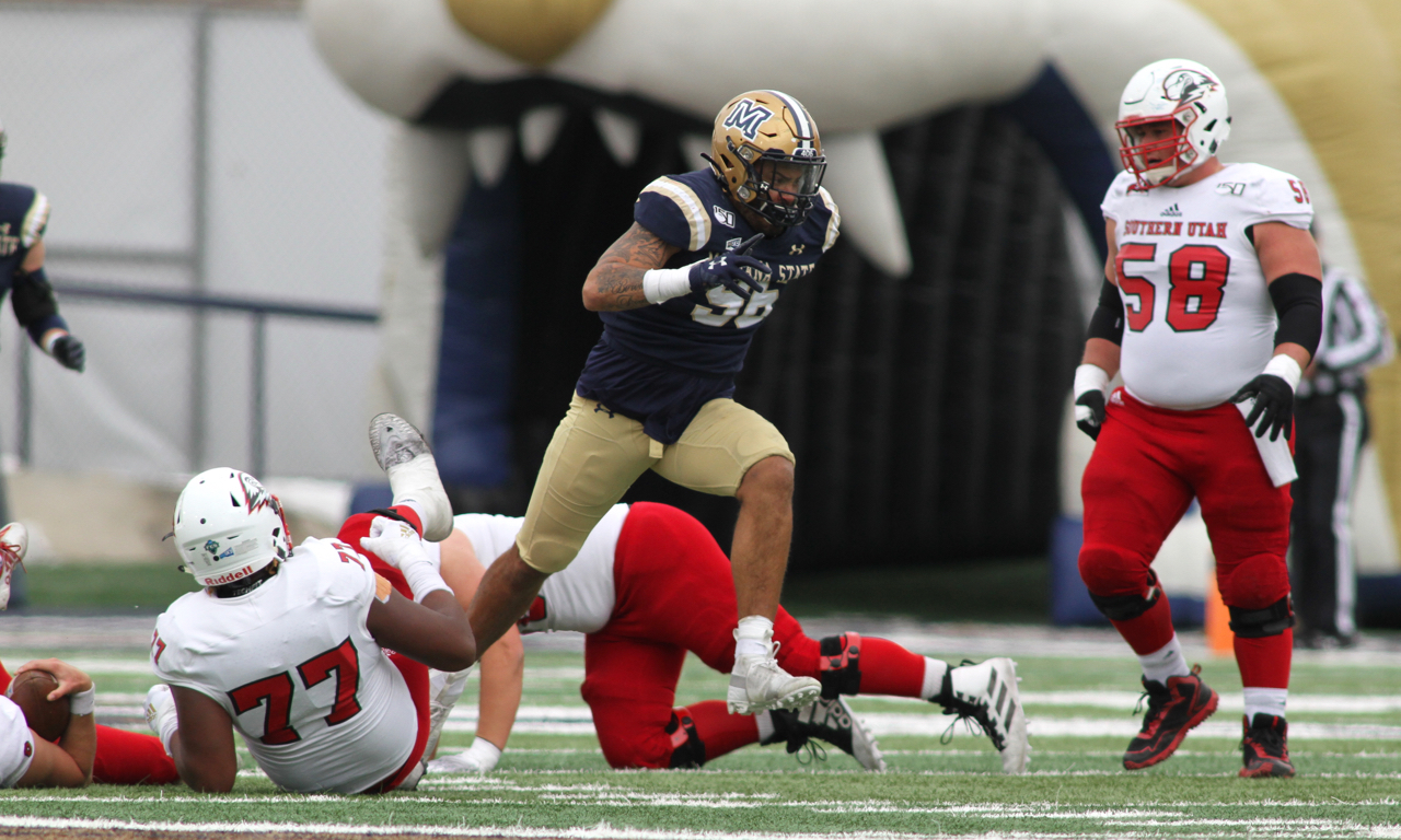 Montana State defensive end Amandre Williams (98) celebrates a sack vs Southern Utah/by Brooks Nuanez
