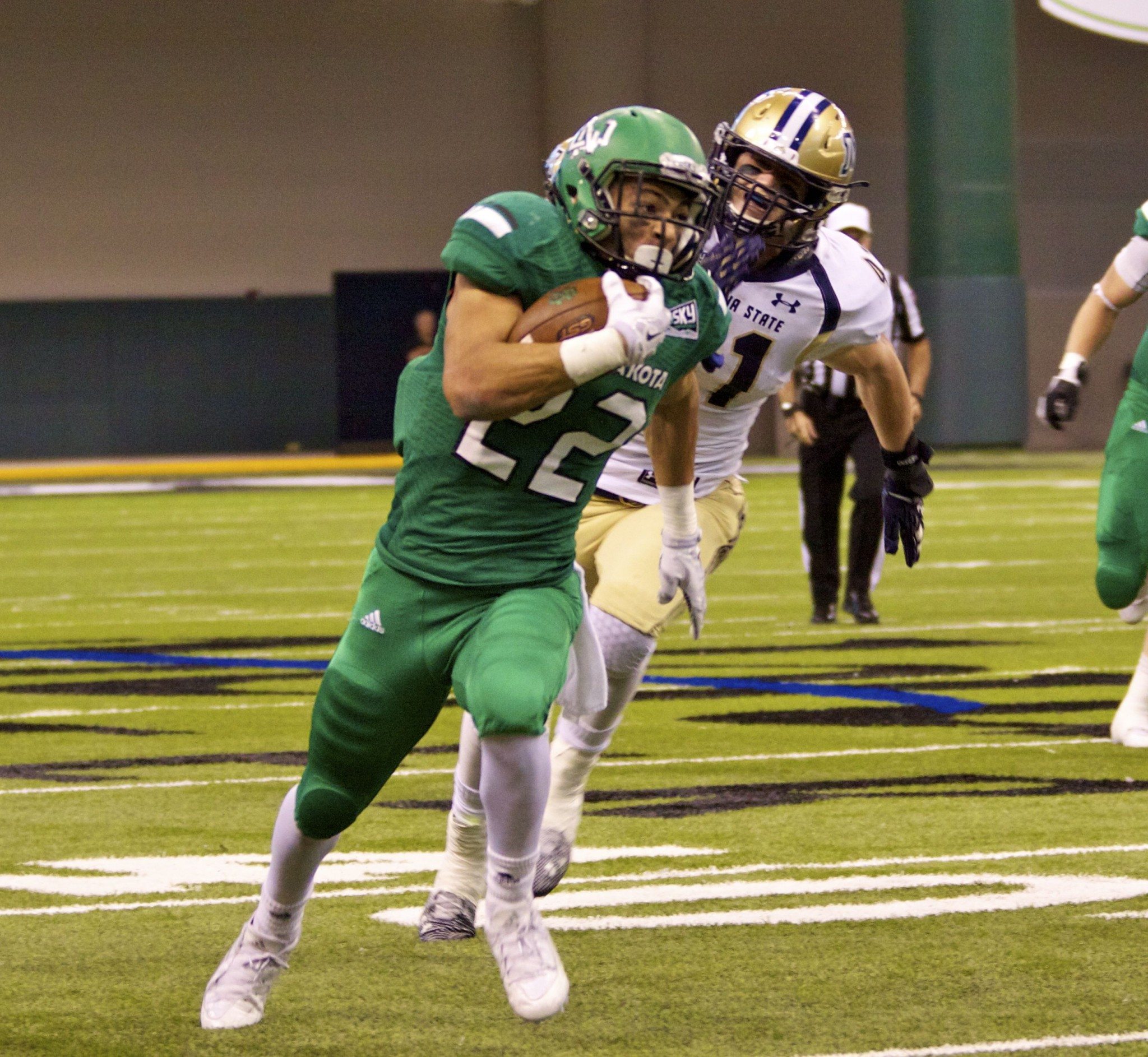 MSU answered the long Santiago burst with a 61-yard touchdown catch by senior Manny Kalfell on a pass thrown by fellow senior wide receiver Mitch Griebel, a former quarterback. But the UND run game continued to churn and Oliveira, a 5-foot-10, 225-pound bull, ripped off his 30-yard TD, the longest of his career.