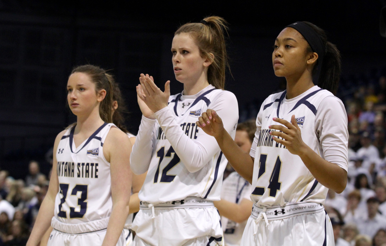 Montana State seniors Hannah Caudill (23) & Delany Junkermier (12) with sophomore Oliana Squires (24)/by Brooks Nuanez
