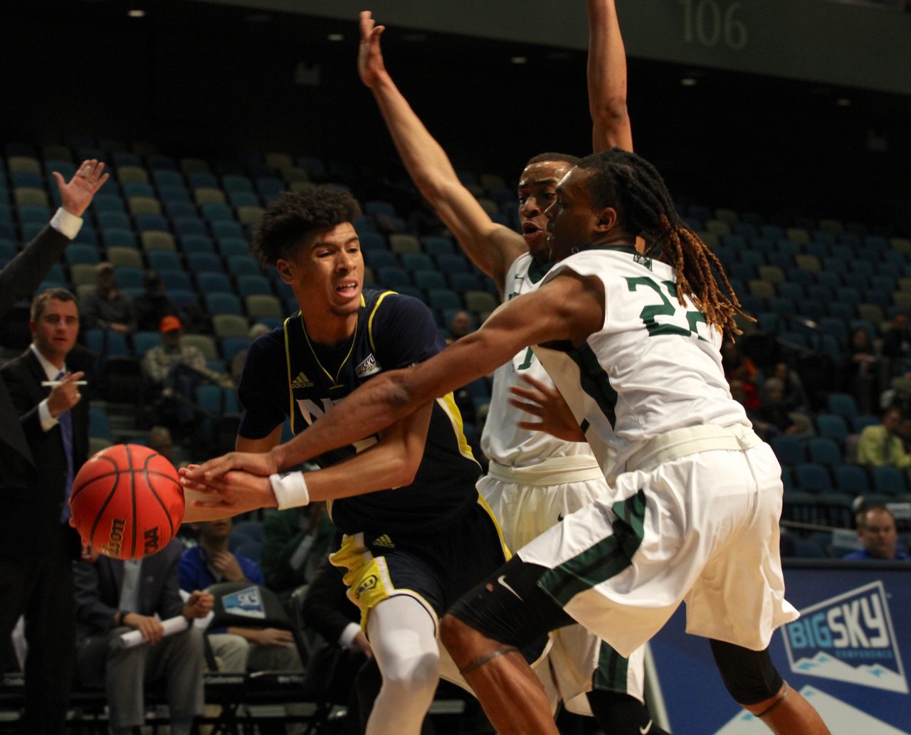 Portland State forwrad Brandon Hollins and former guard Calaen Robinson pressure Northern Arizona guard JoJo Anderson/by Brooks Nuanez