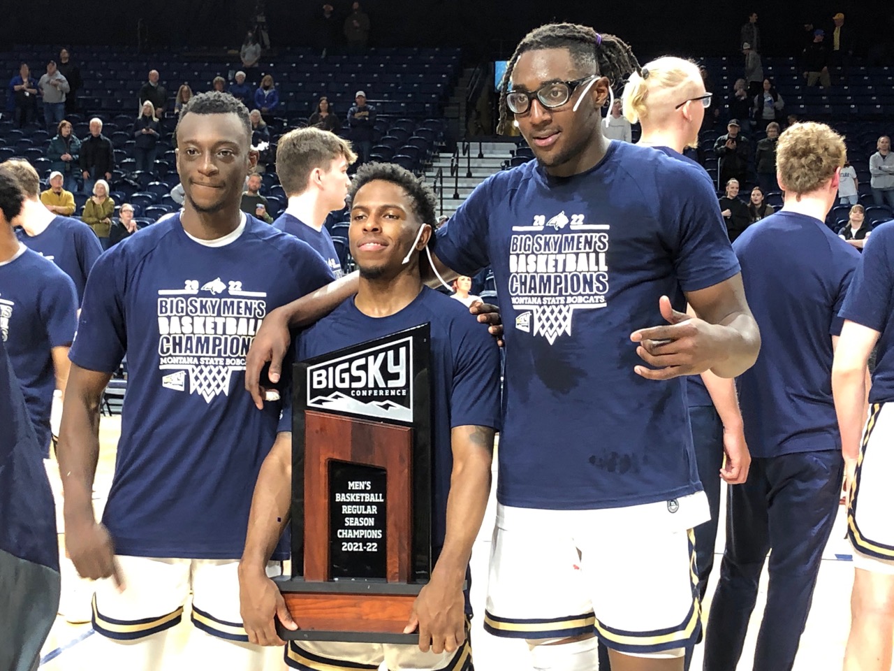 From left, Montana State senior guard Amin Adamu, super senior point guard @XaTheeGreaat5 & junior center @jubrilebelo13 celebrate following securing a share of #BigSkyMBB title. pic.twitter.com/Qd3IpLDt53