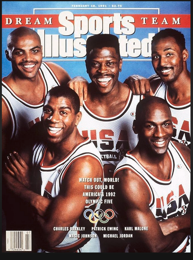 “Watch out world! This could be America’s 1992 Olympic Five” reads the sub headline, centered between a photo of Michael Jordan, Magic Johnson, Charles Barkley, Patrick Ewing and Karl Malone.