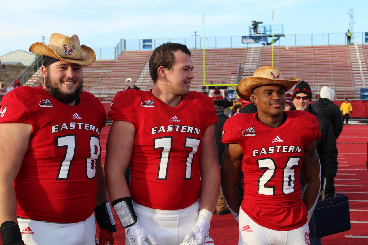 Eastern Washington’s players pose with cowboy hats on following Saturday’s win/ by Colter Nuanez