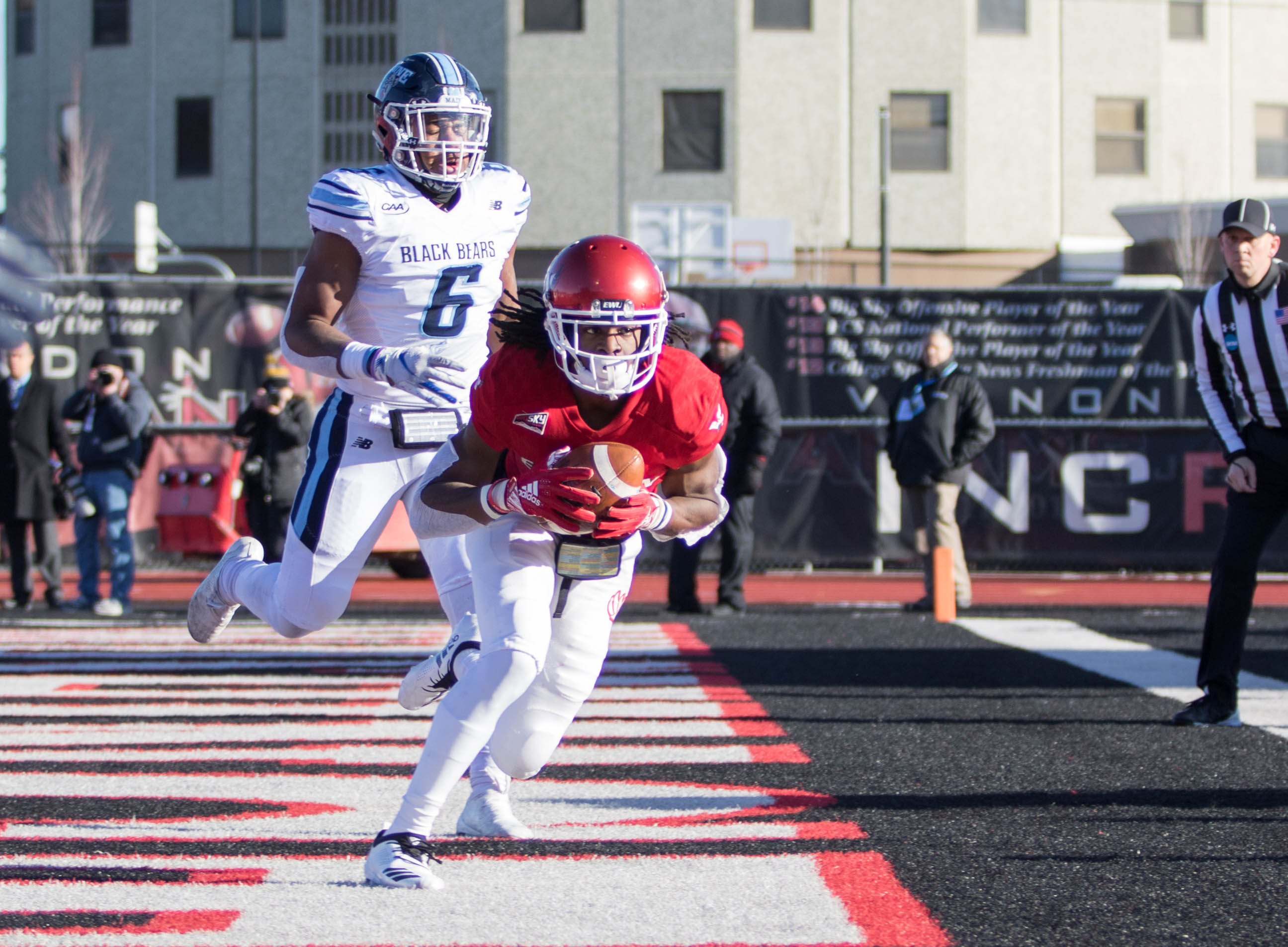 Barriere also rushed for 53 yards on seven carries and EWU did not allow a sack to a Maine defense that entered the game with 47 sacks, second in the FCS. McPherson rushed for a team-high 64 yards as the Eagles averaged six yards per carry against a defense that had not allowed more than 153 yards in a single game this season. The Black Bears’ “Black Hole” defense entered the game giving up 70 rushing yards per game and stuffed Weber State to the tune of -1 yard rushing in Ogden last week.