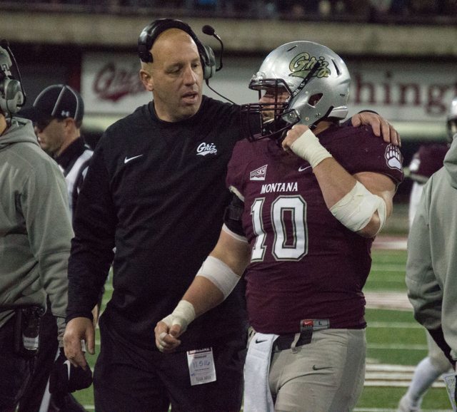 Former Montana special teams coach Travis Niekamp, pictured here in 2018 with UM inebacker Connor Strahm/ by Jason Bacaj