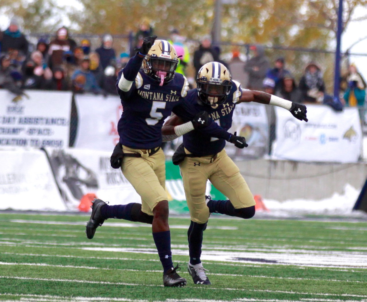 Montana State defensive backs Jahque Alleyne (5) and Greg “Munchie” Filer III both had interceptions for MSU at Weber State on Saturday/ by Brooks Nuanez