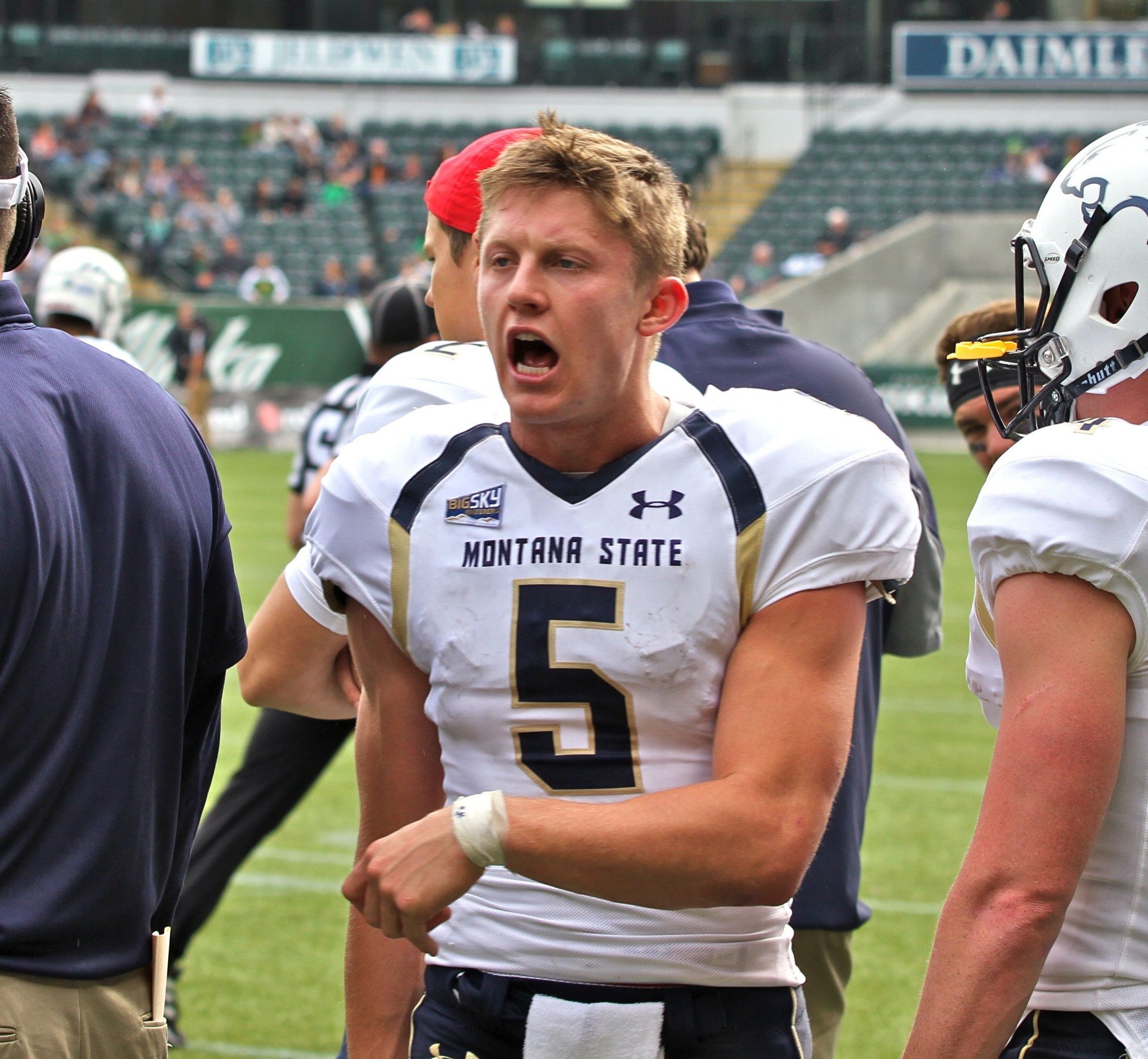 MSU quarterback Dakota Prukop motivates his team on the sideliens
