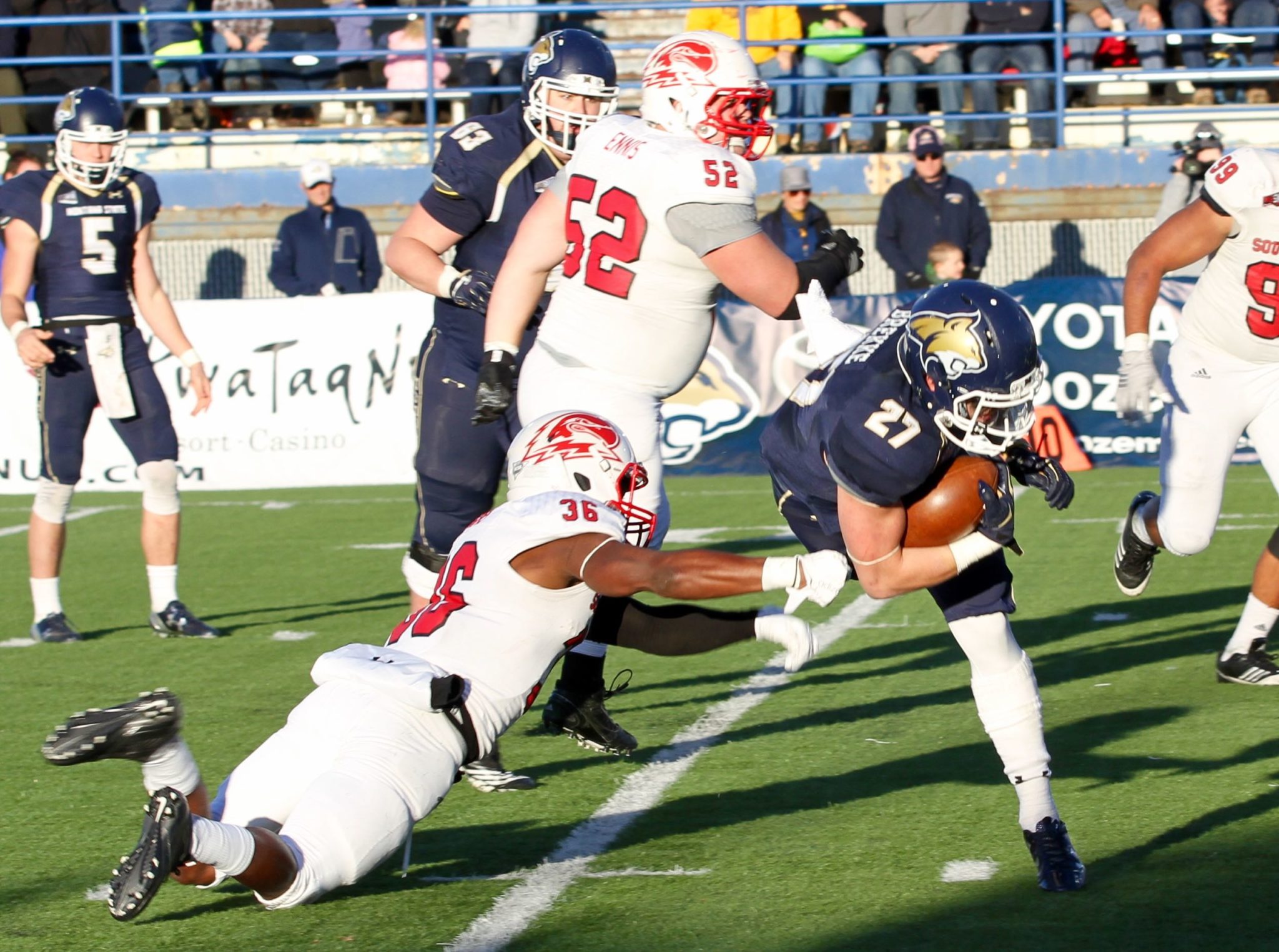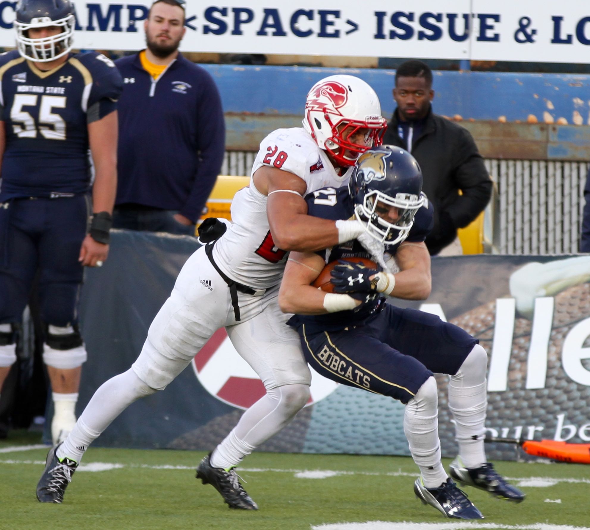 Southern Utah cornerback LeShaun Simms tackles Montana State running back Gunnar Brekke at the line of scrimmage/by Brooks Nuanez