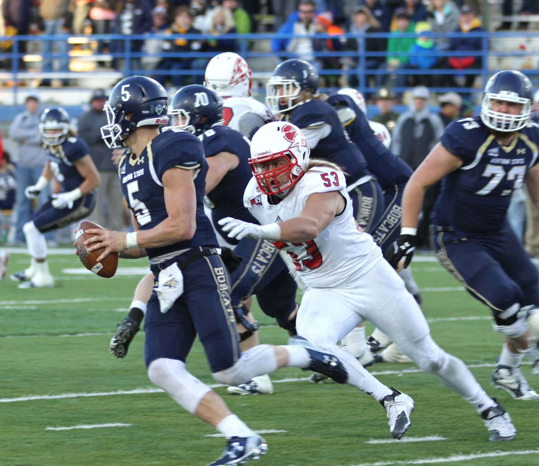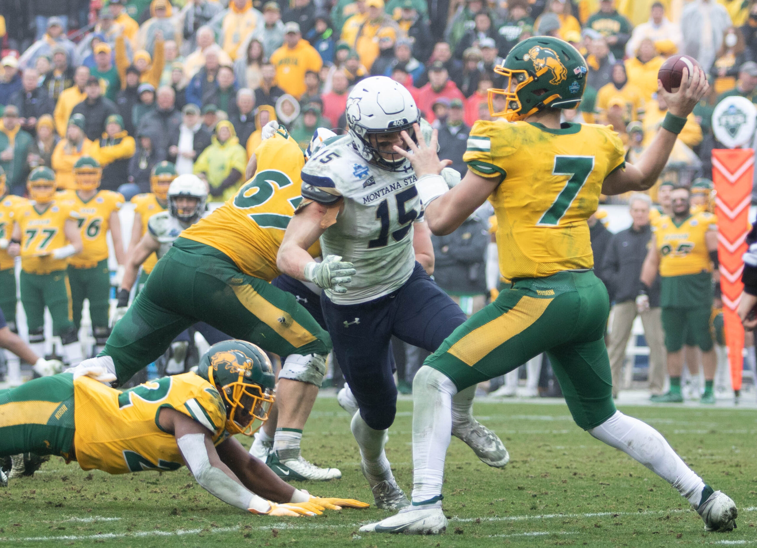 Montana State defensive end Bryce Sterk (37) hurries Northern Arizona quarterback Case Cookus (15)/by Brooks Nuanez