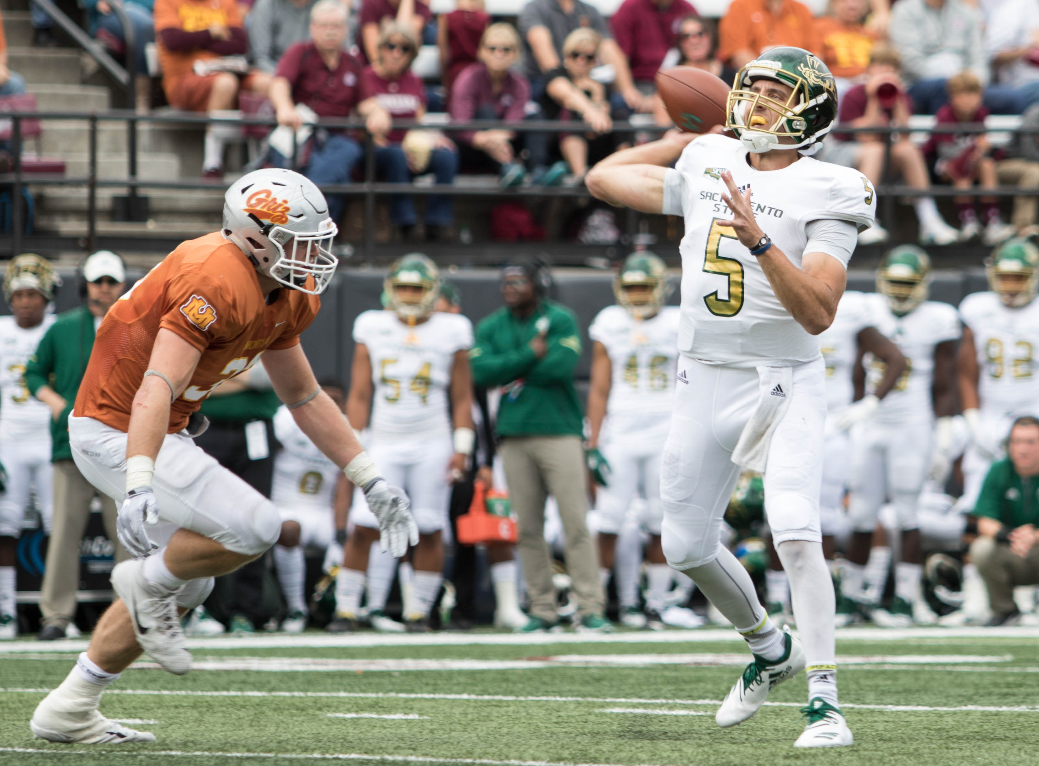 Sac State quarterback Kevin Thomson throws while under pressure from Montana linebacker Dante Olson/ by Jason Bacaj