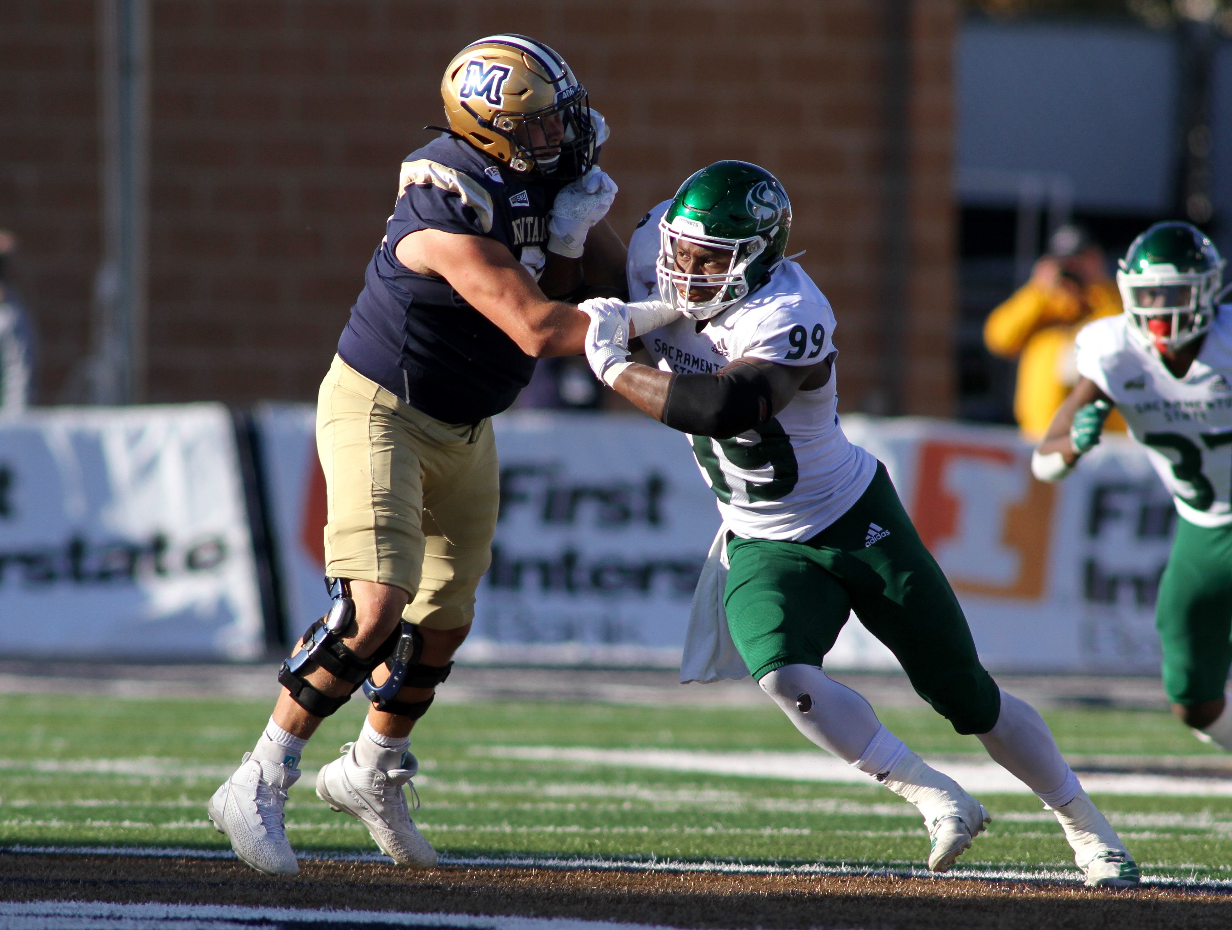 Sacramento State defensive end George Obinna (99) gets the edge on Montana State tackle Connor Wood (63) in 2019/by Brooks Nuanez