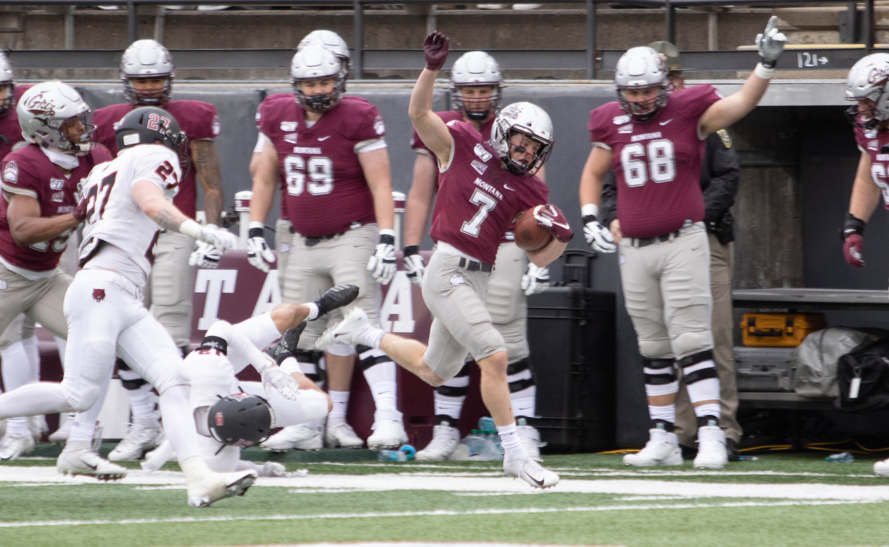 Montana wide receiver Gabe Sulser (7) runs after the catch to a 46-yard touchdown/by Brooks Nuanez