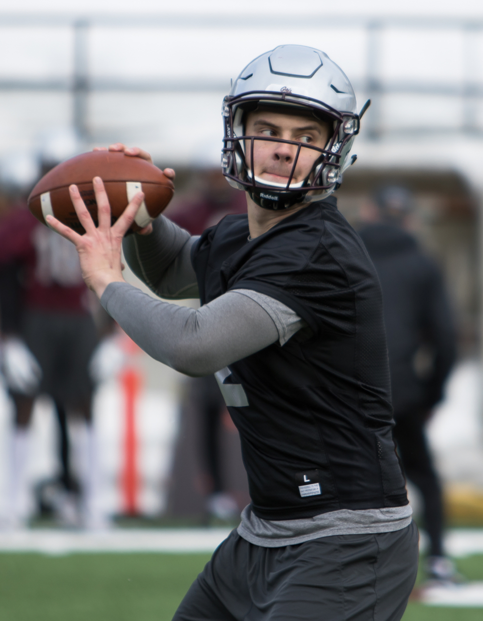 Griz sophomore quarterback Gresch Jensen makes a pass during a spring practice drill in Washington-Grizzly Stadium on March 5, 2018/ by Lacey Young