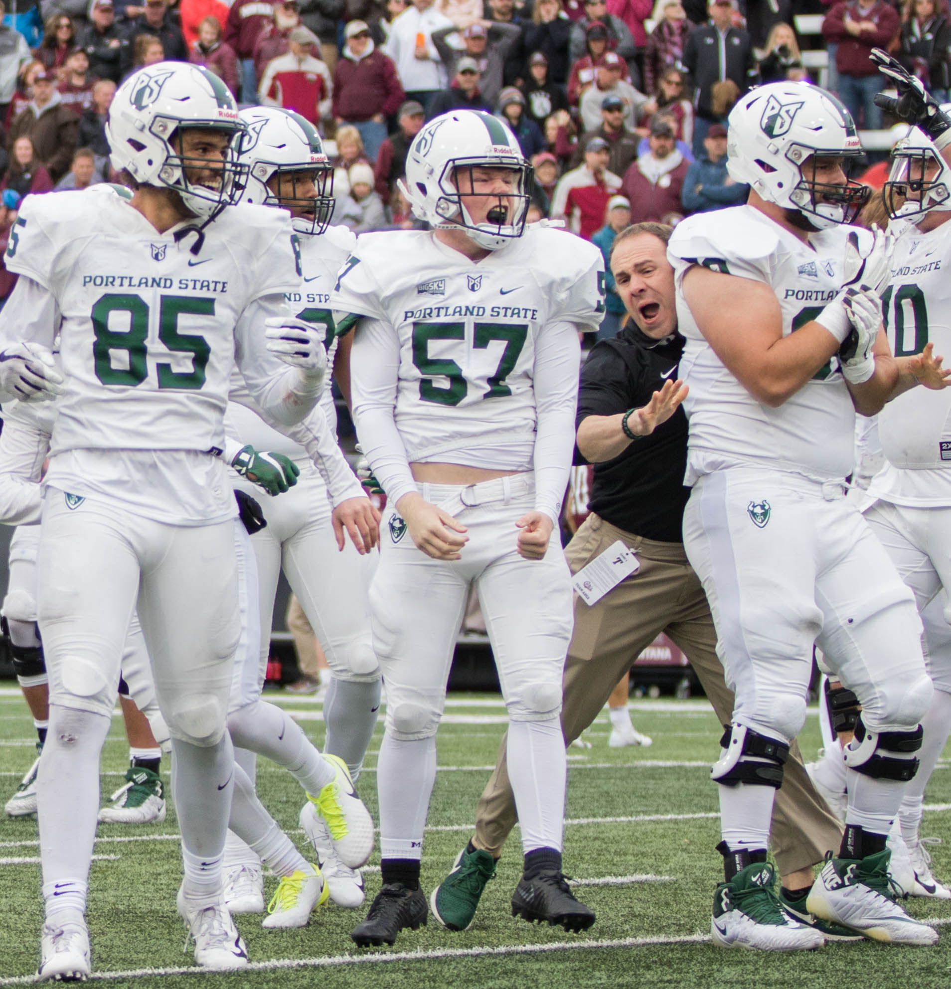 Portland State kicker Cody Williams (57) celebrates his game-winning field goal to beat Montana in Missoula/ by Jason Bacaj