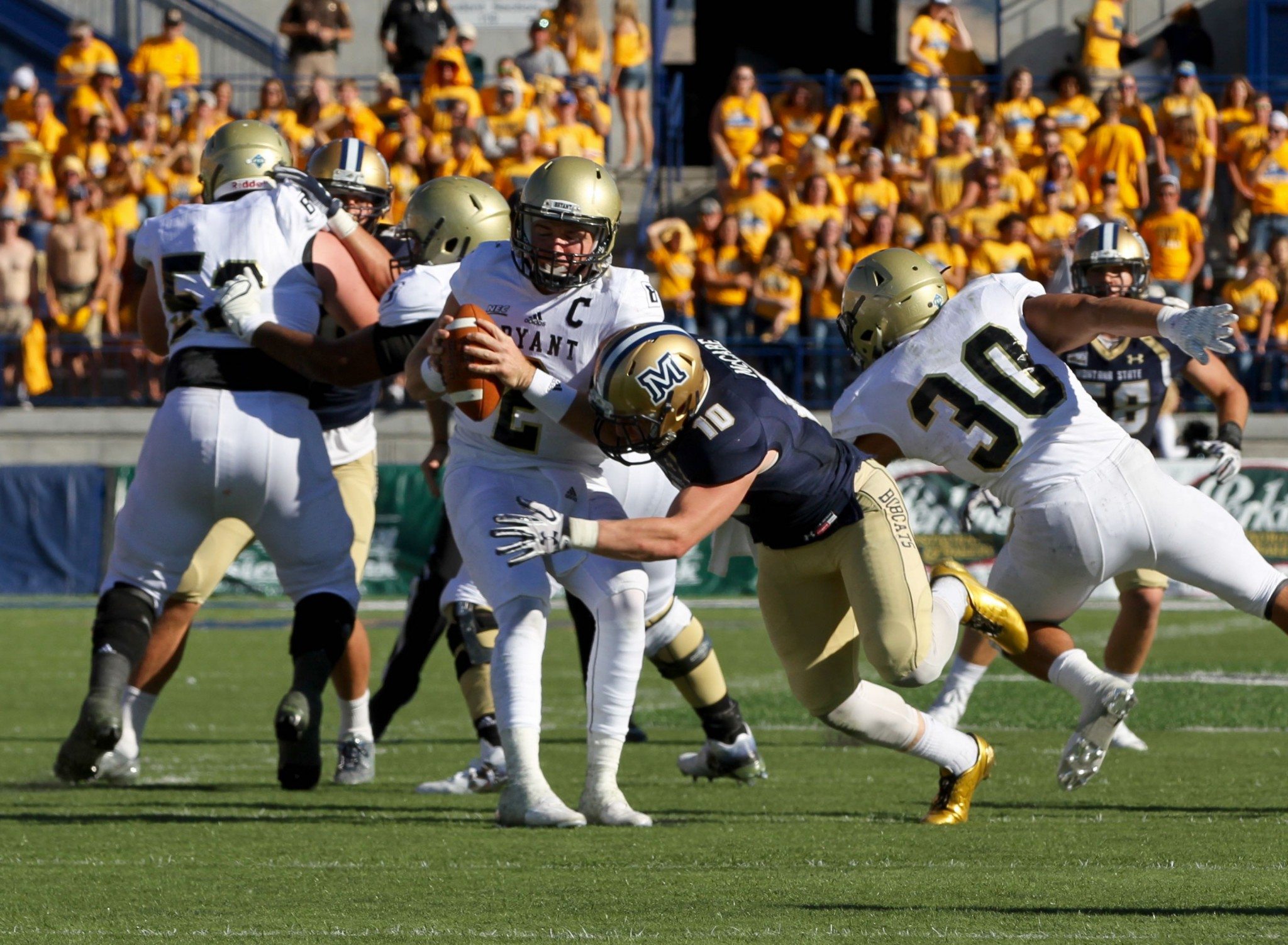 Former Montana State safety Bryson McCabe (10) pressures Bryant quarterback Dalton Easton (2) in 2016/by Brooks Nuanez