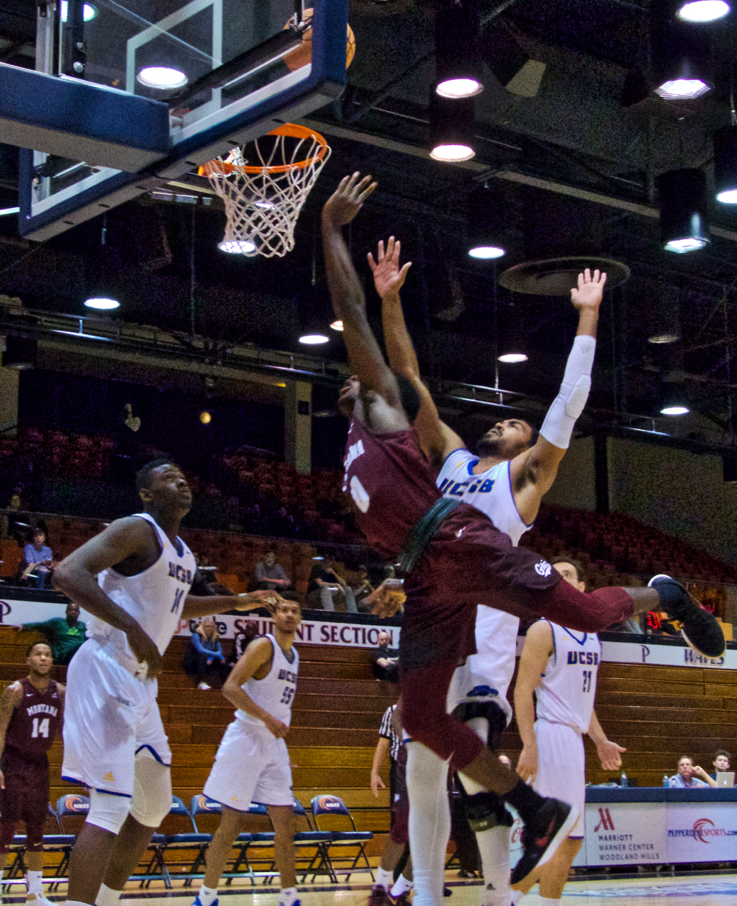 Montana junior guard Michael Oguine goes to the rim against UC Santa Barbara/ by Glenn Junkert, for Skyline Sports