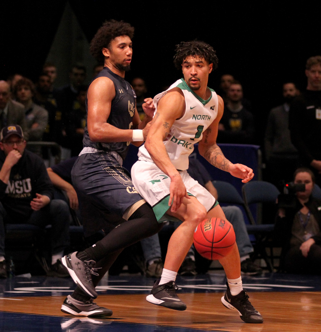 North Dakota guard Marlon Stewart (1) defended by former high school teammate Tyler Hall (3)/by Brooks Nuanez