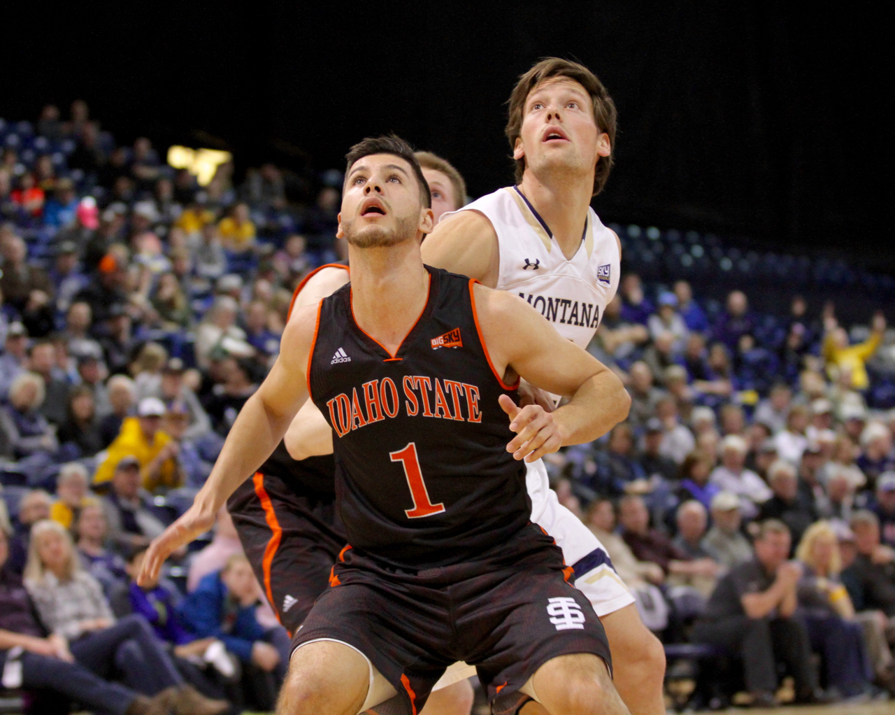 Idaho State point forward Geno Luzcando (1) boxes out Montana State forward Konner Frey (22)/by Brooks Nuanez