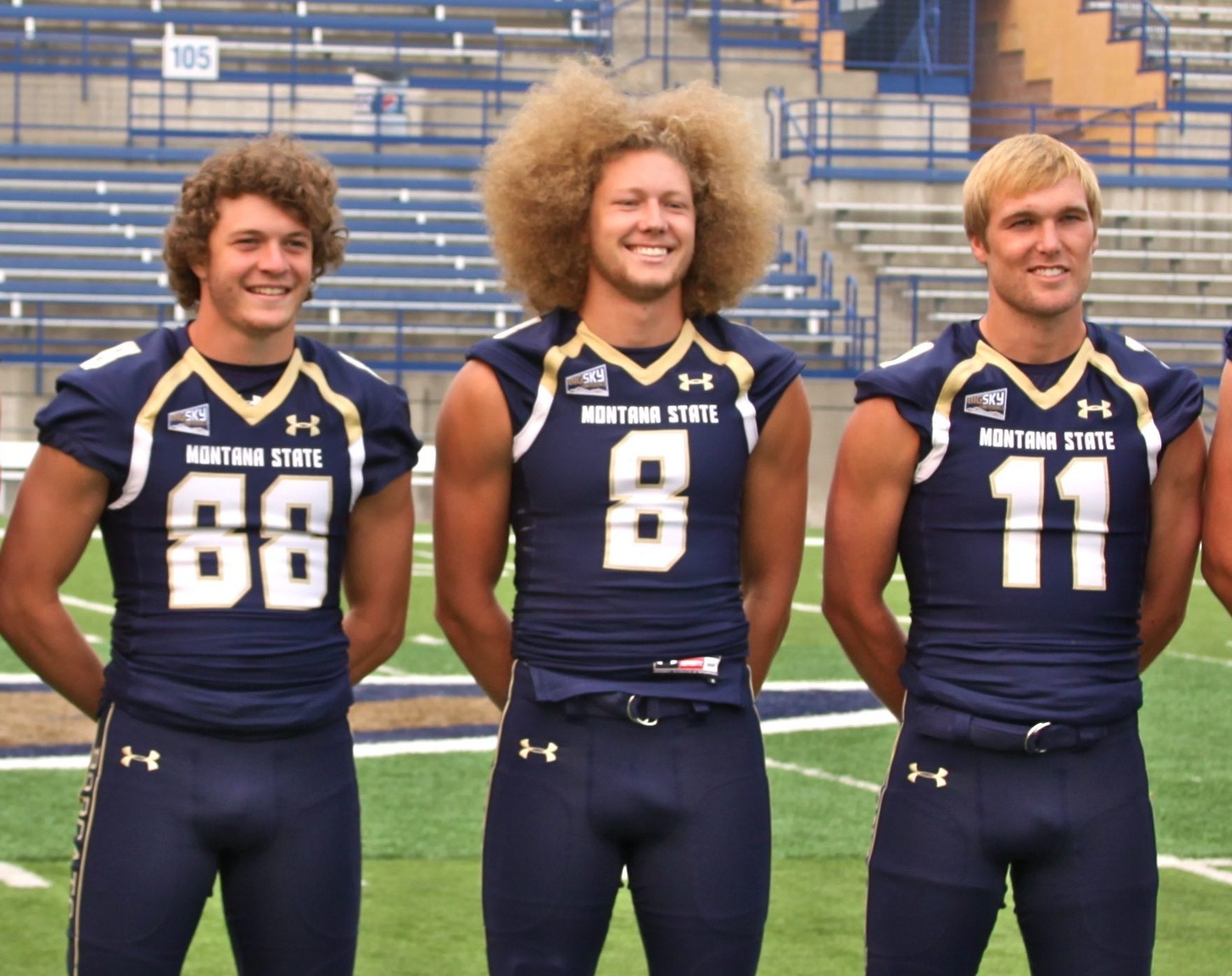 Montana State wide receivers and Bozeman High alums, from left, John D’Agostino, the late Manny Kalfell and Tanner Roderick, pictured here on media day in 2015/by Brooks Nuanez