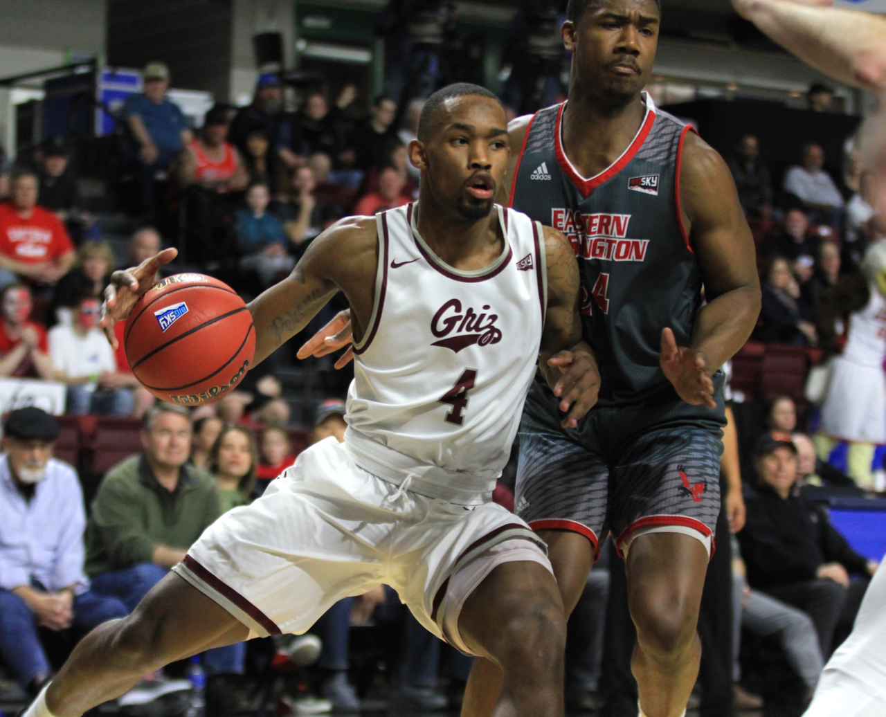 Montana forward Sayeed Pridgett (4) slide steps against Eastern Washington forward Kim Aiken (24)/by Brooks Nuanez