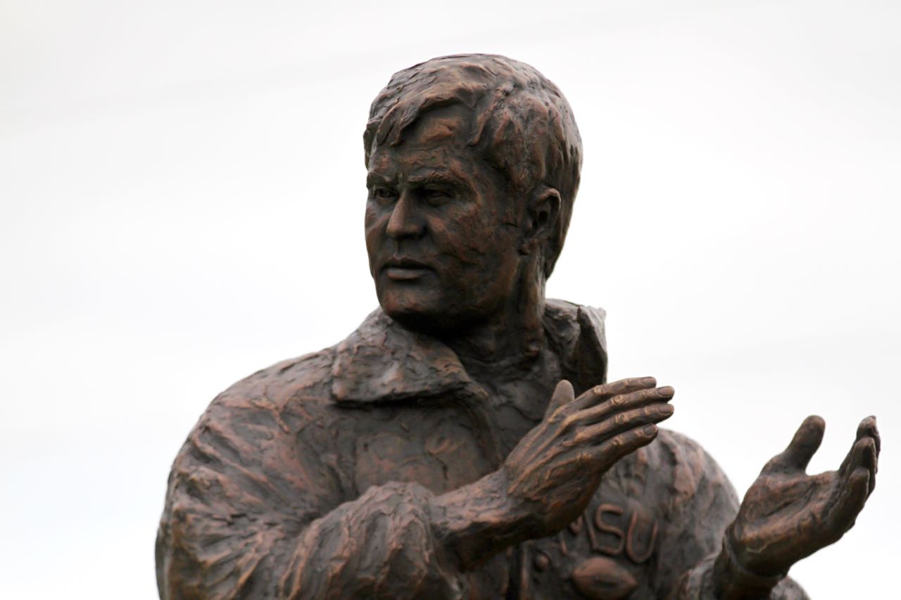 The statue shows Holland depicted in his coaching years running, looking back wistfully at Bobcat Stadium. It is inscribed with his famous saying, ‘This is the time…This is the place…Go Cats!’ The statue is detailed right down to Holland’s wristwatch showing 1 p.m., the traditional kickoff during Holland’s coaching days.