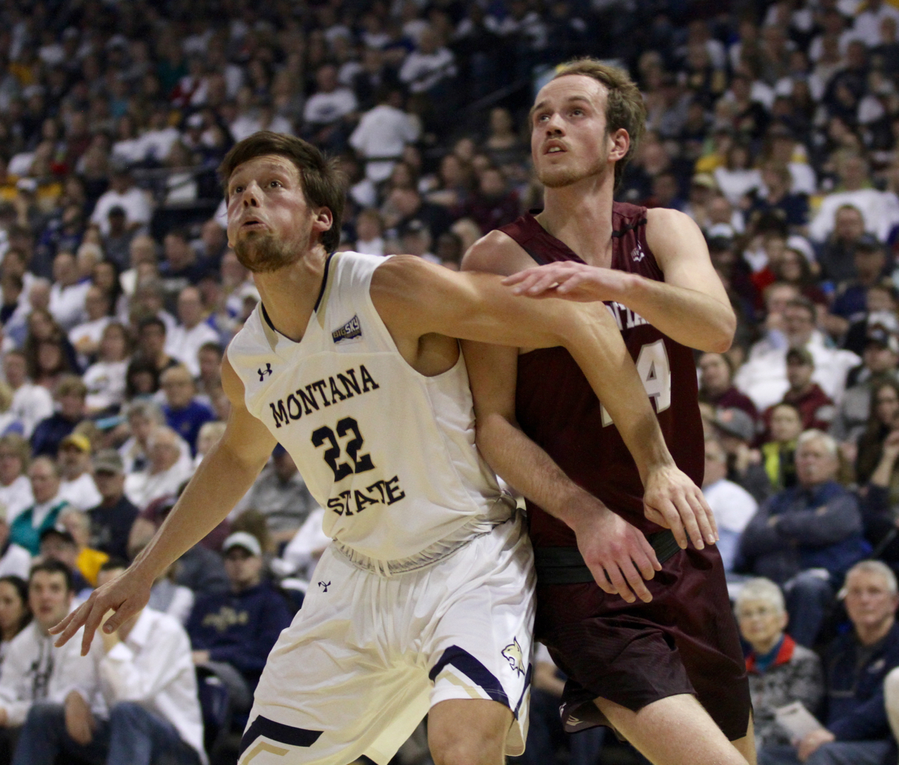 Montana forward Bobby Moorehead (24) fights for a rebound with Montana State forward Konner Frey (22)/by Brooks Nuanez