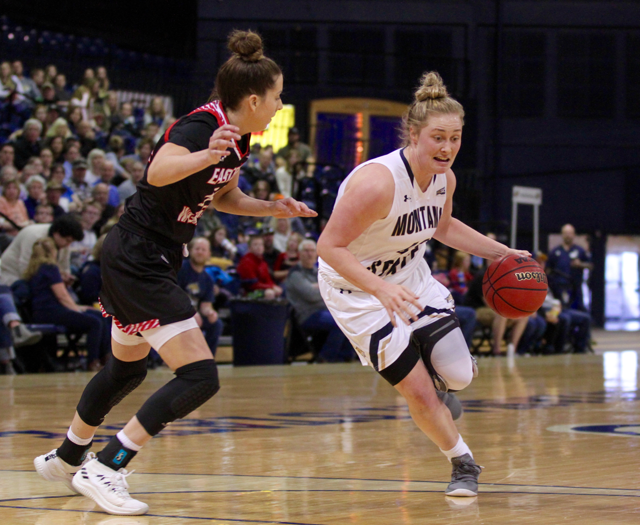 Eastern Washington guard Violet Kapri Morrow (12) defended by Montana State guard Halle Wright (42)/by Brooks Nuanez