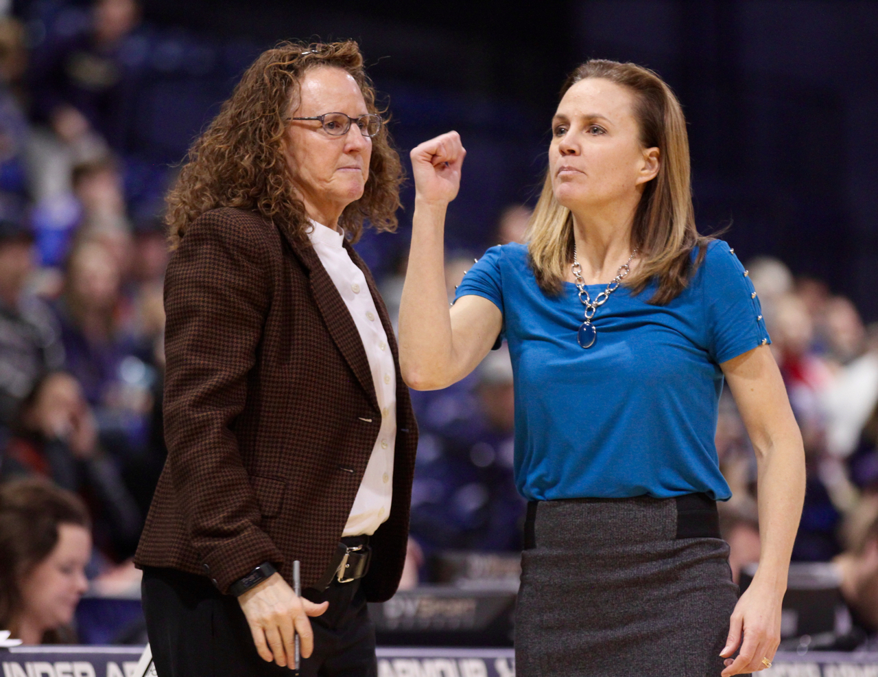 Montana State head coach Tricia Binford (R) with assistant coach Sunny Smallwood (L)/by Brooks Nuanez