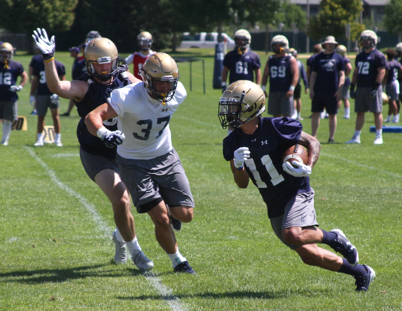 Choate saw detail work, getting in and out of huddles and playcalling, emerge as an area of emphasis. Choate has expressed a level of comfort with a coaching staff that now has been together for the better part of three seasons, leading to splitting fields and doubling the amount of reps. 1s & 2s on the near field, 3s & 4s in the middle running multiple huddles and a firestorm approach to team sessions.