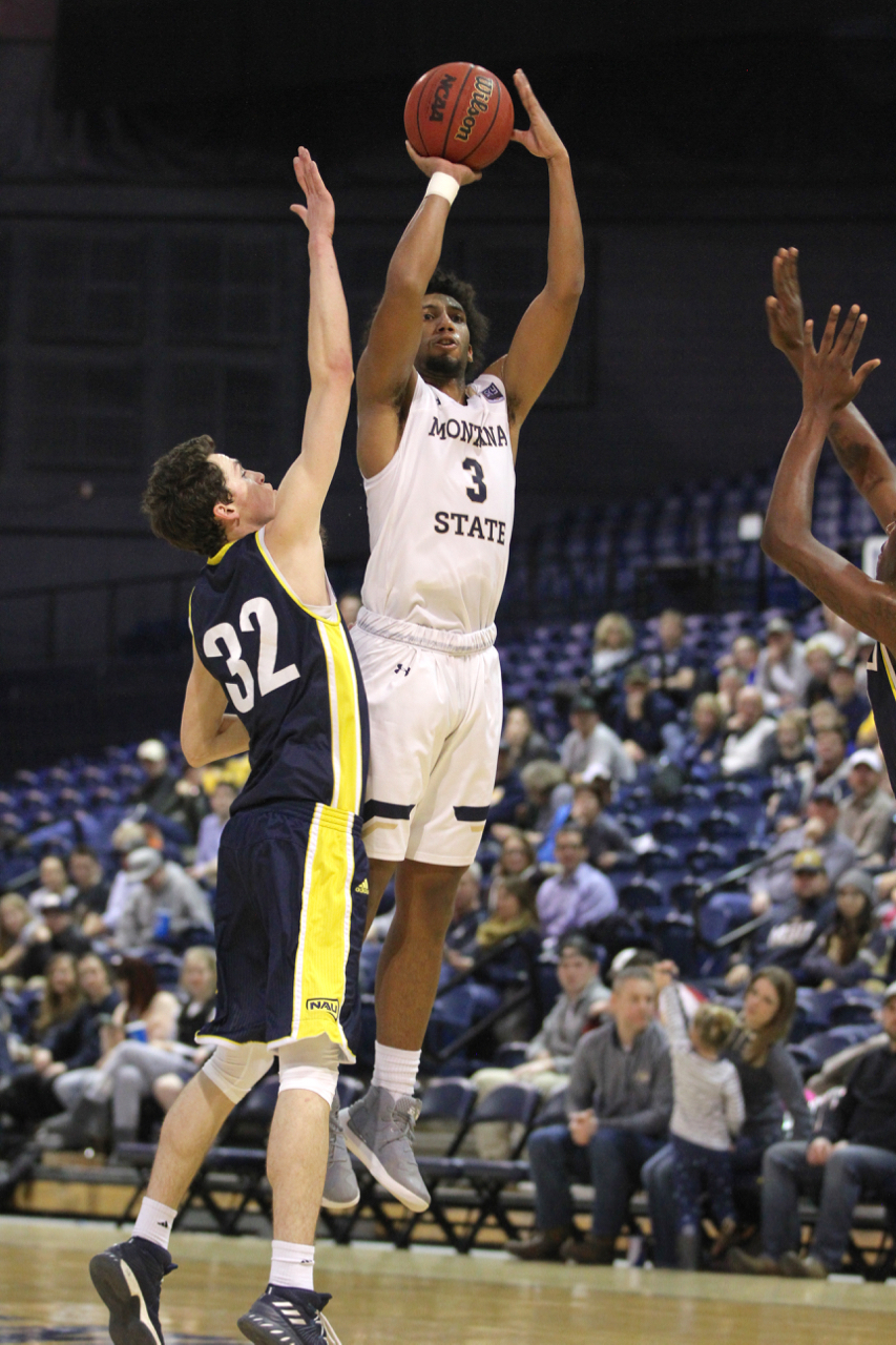 Montana State guard Tyler Hall attempts a three with Northern Arizona forward Chris Bowling (32) defending/by Brooks Nuanez