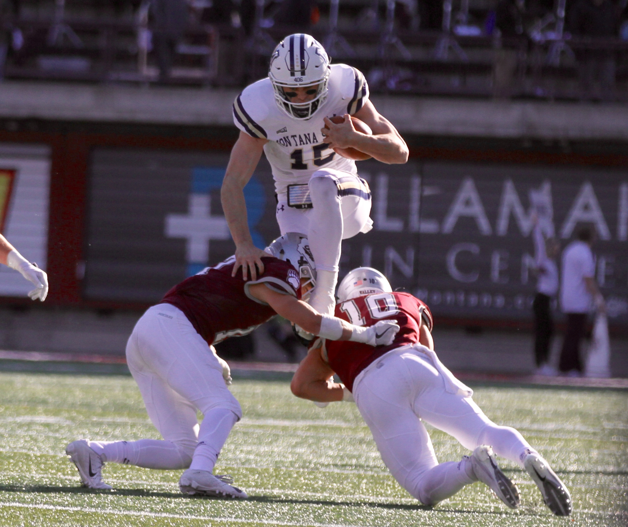 Montana State safeties Bryson McCabe (L) & Khari Garcia (R) tackle Kennesaw State quarterback Chandler Burks (C) during a game at Montana State in 2017/ by Brooks Nuanez