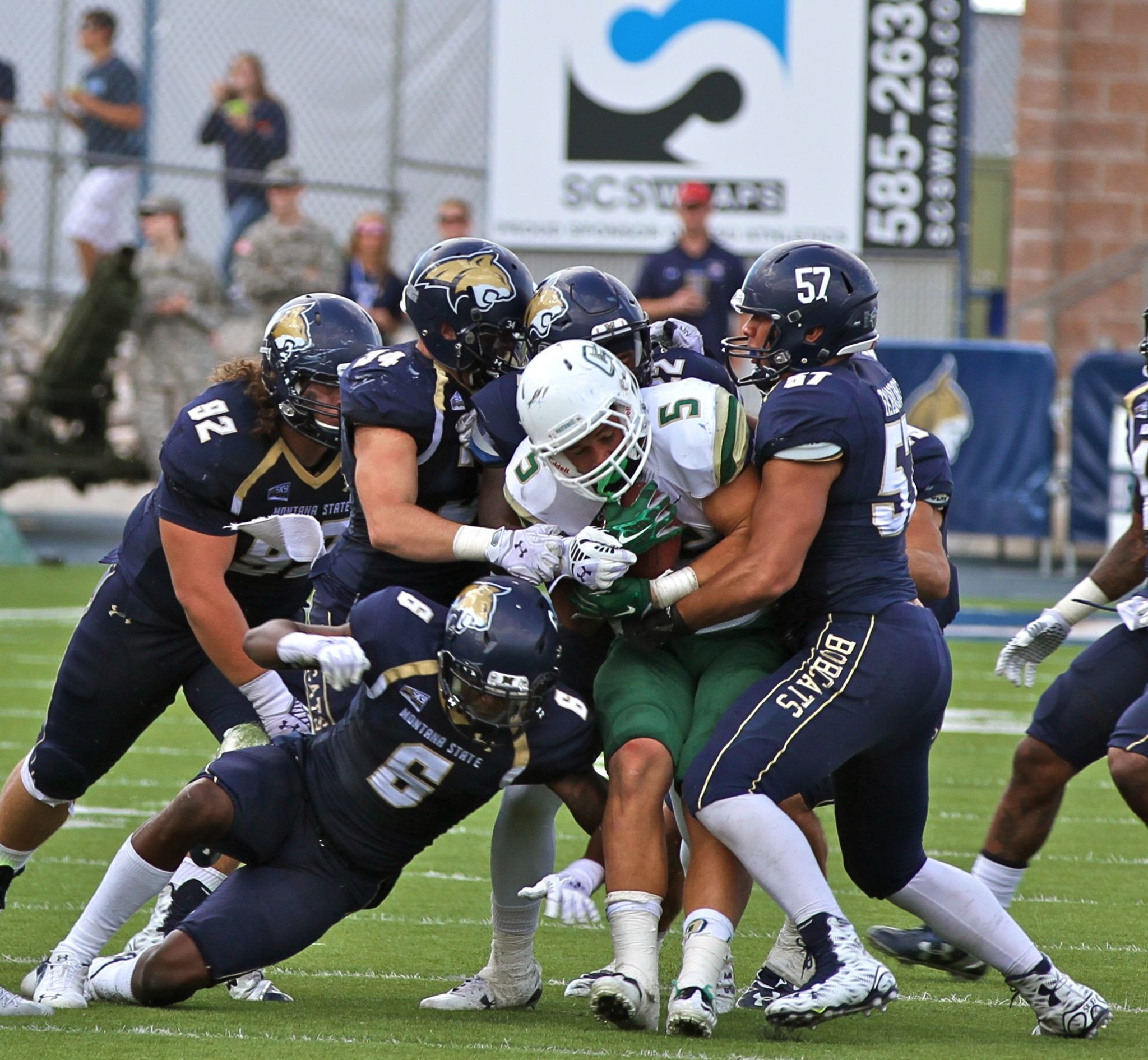 Montana State defenders tackle Cal Poly running back Joe Protheroe (5) in 2015/by Brooks Nuanez